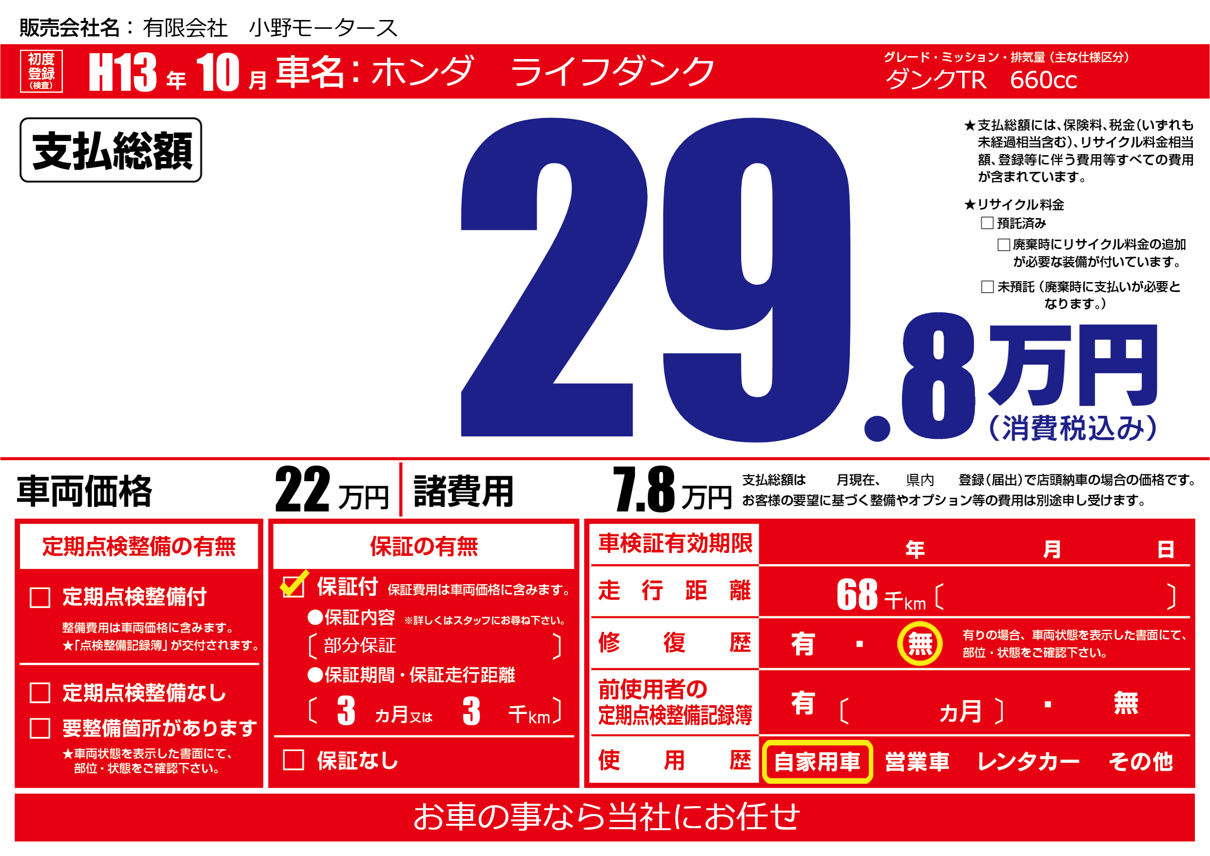 保証付き 保証内容(部分保証) 3ヶ月または(3)千kmまで |