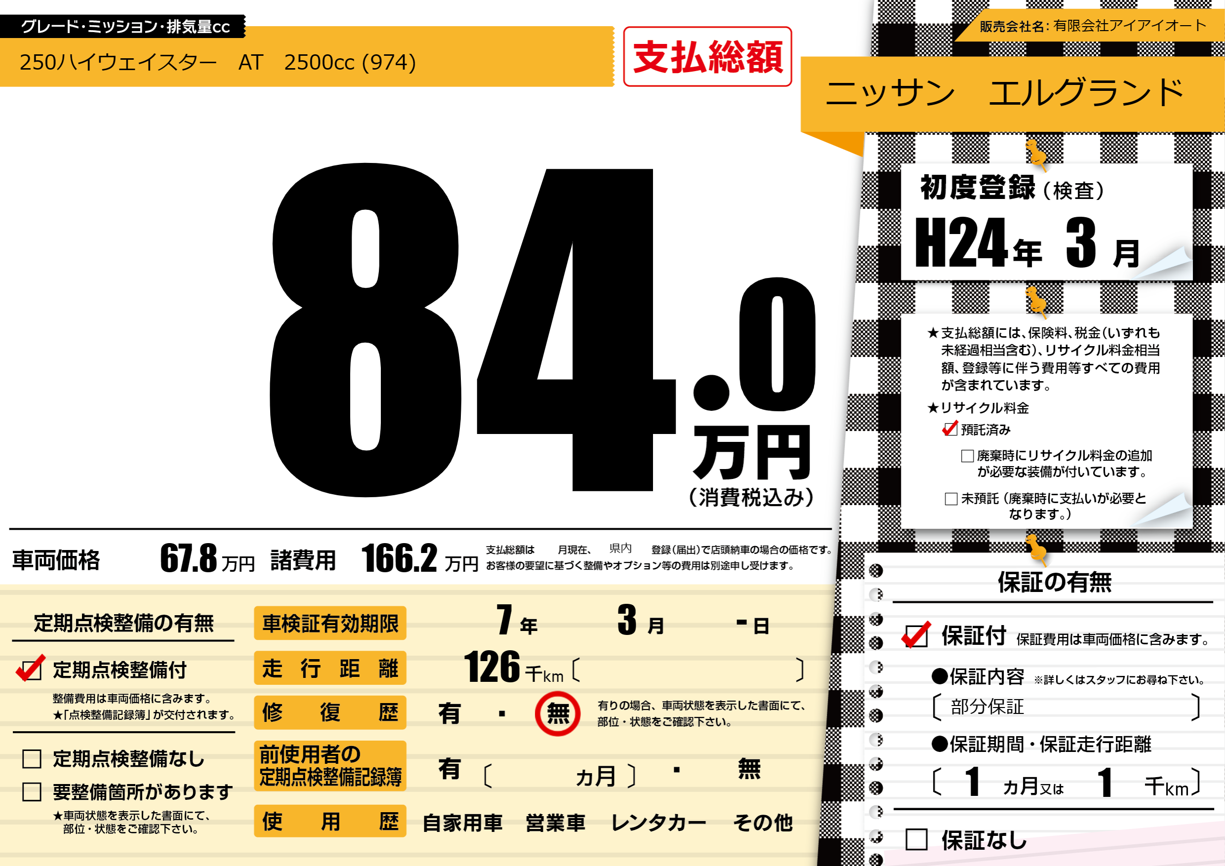 | 車名 | ニッサン エルグランド | グレード ミッション 排気量 |