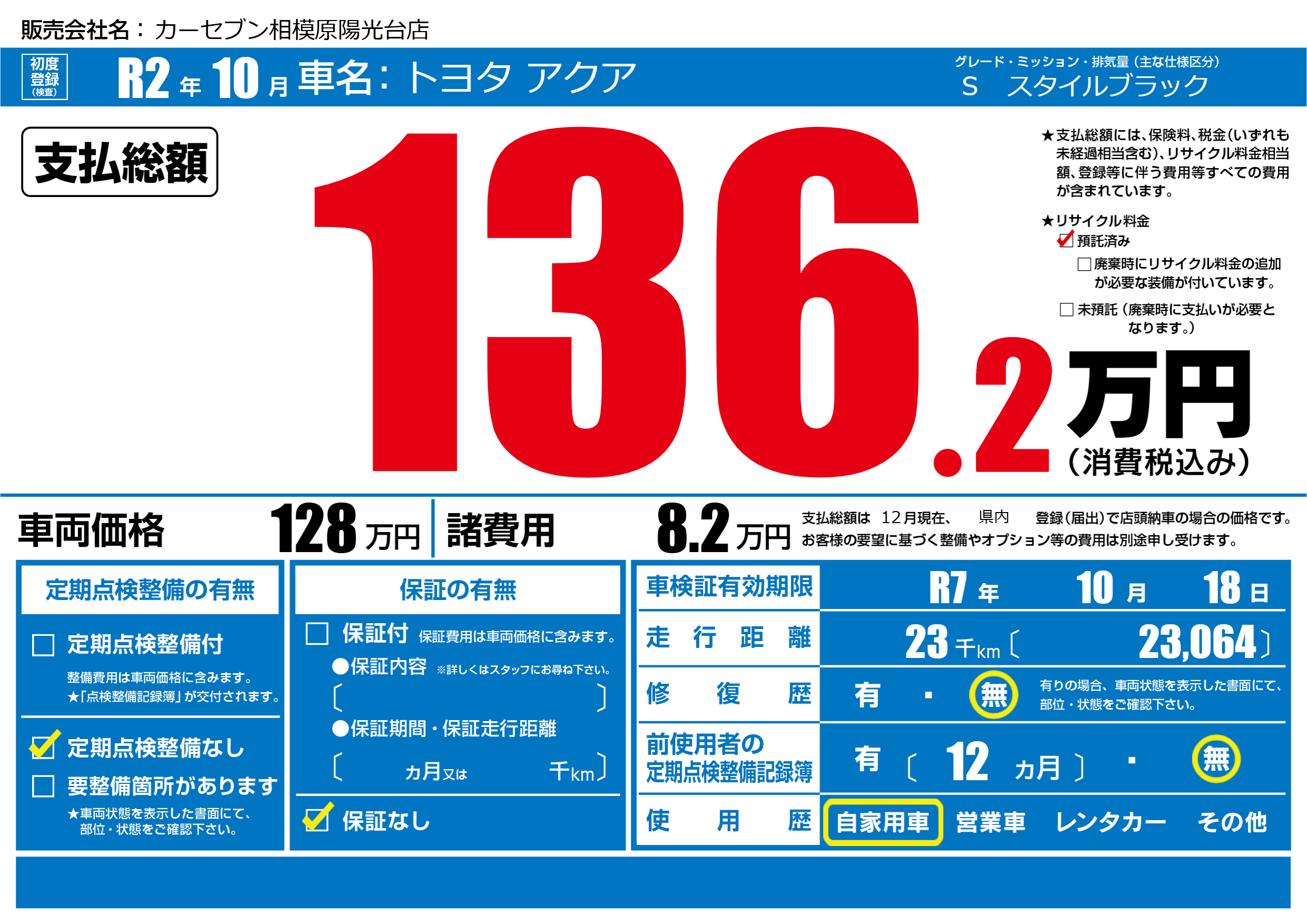 | 車名 | トヨタ アクア | グレード ミッション 排気量 |