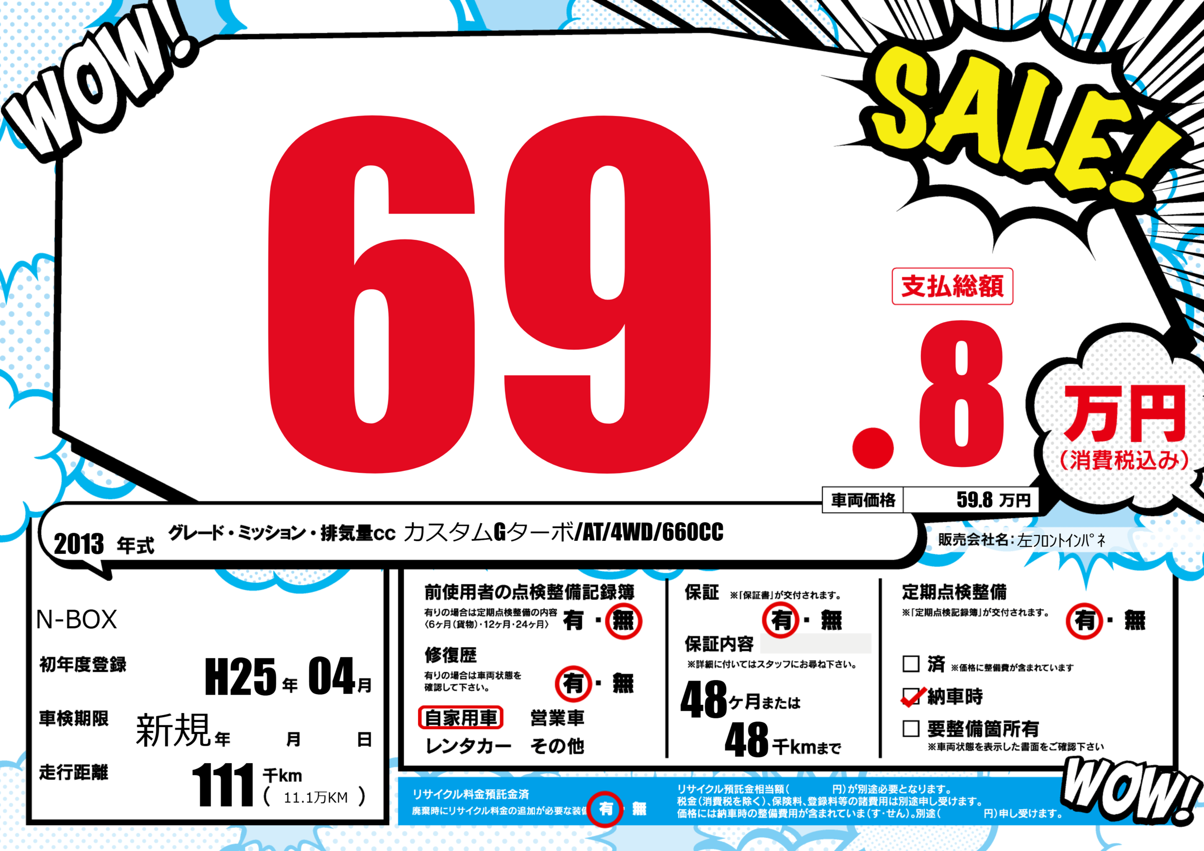 | 走行キロ | 11.1万km | 初年度登録 | H25年04月 |