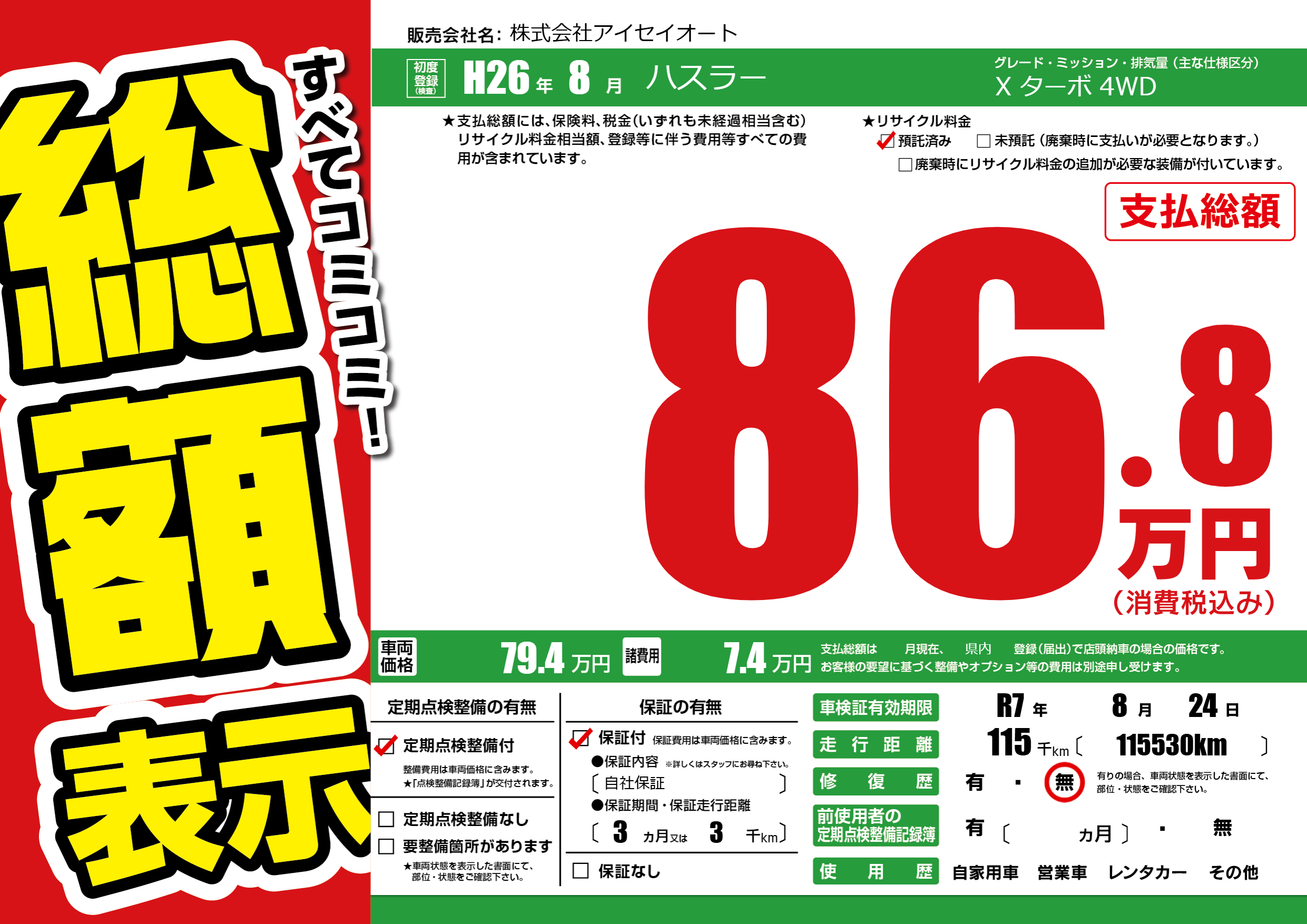 なし | 車検制限 | R7年8月24月 |