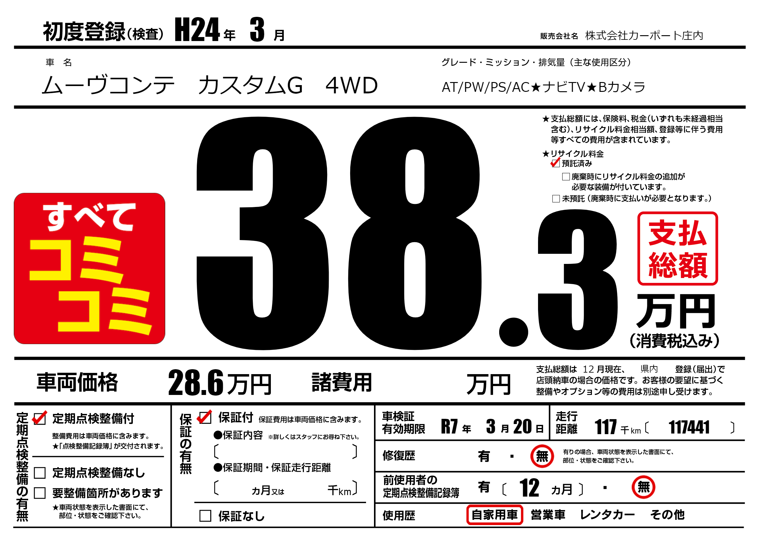 | 車名 | ムーヴコンテ カスタムG 4WD | グレード ミッション 排気量 |