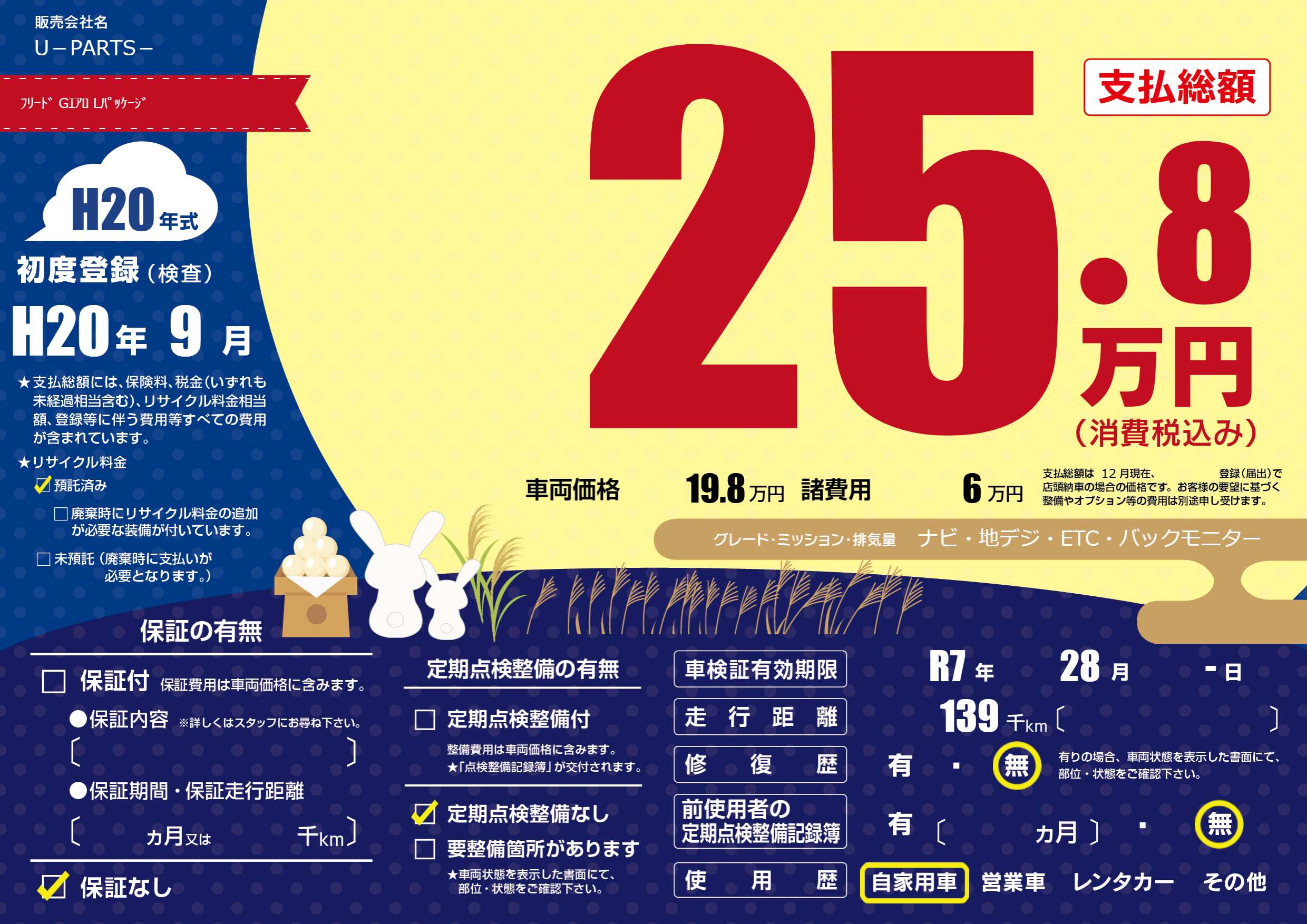 | 走行キロ | 13.9万km | 初年度登録 | H20年9月 |
