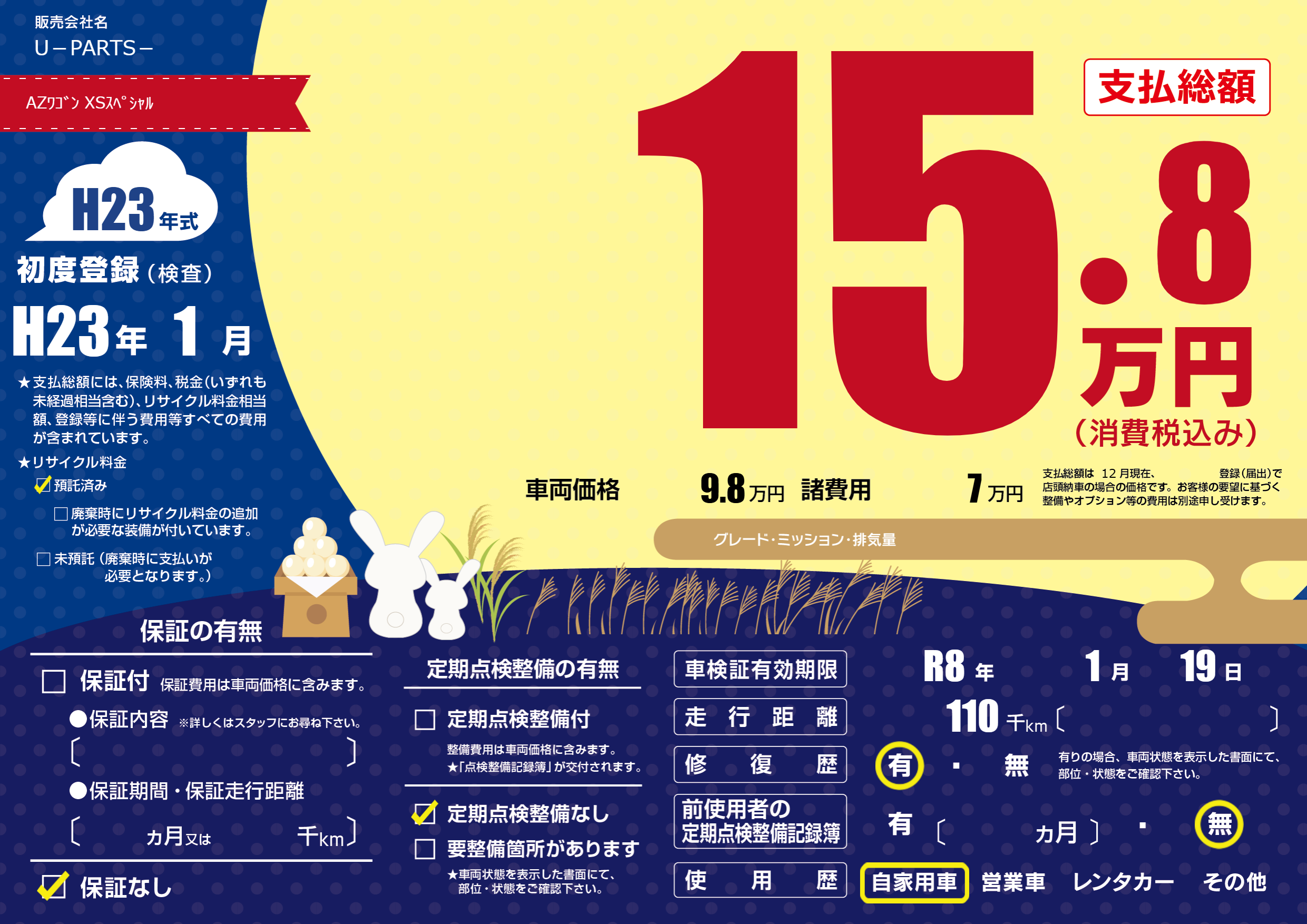 | 走行キロ | 11万km | 初年度登録 | H23年1月 |