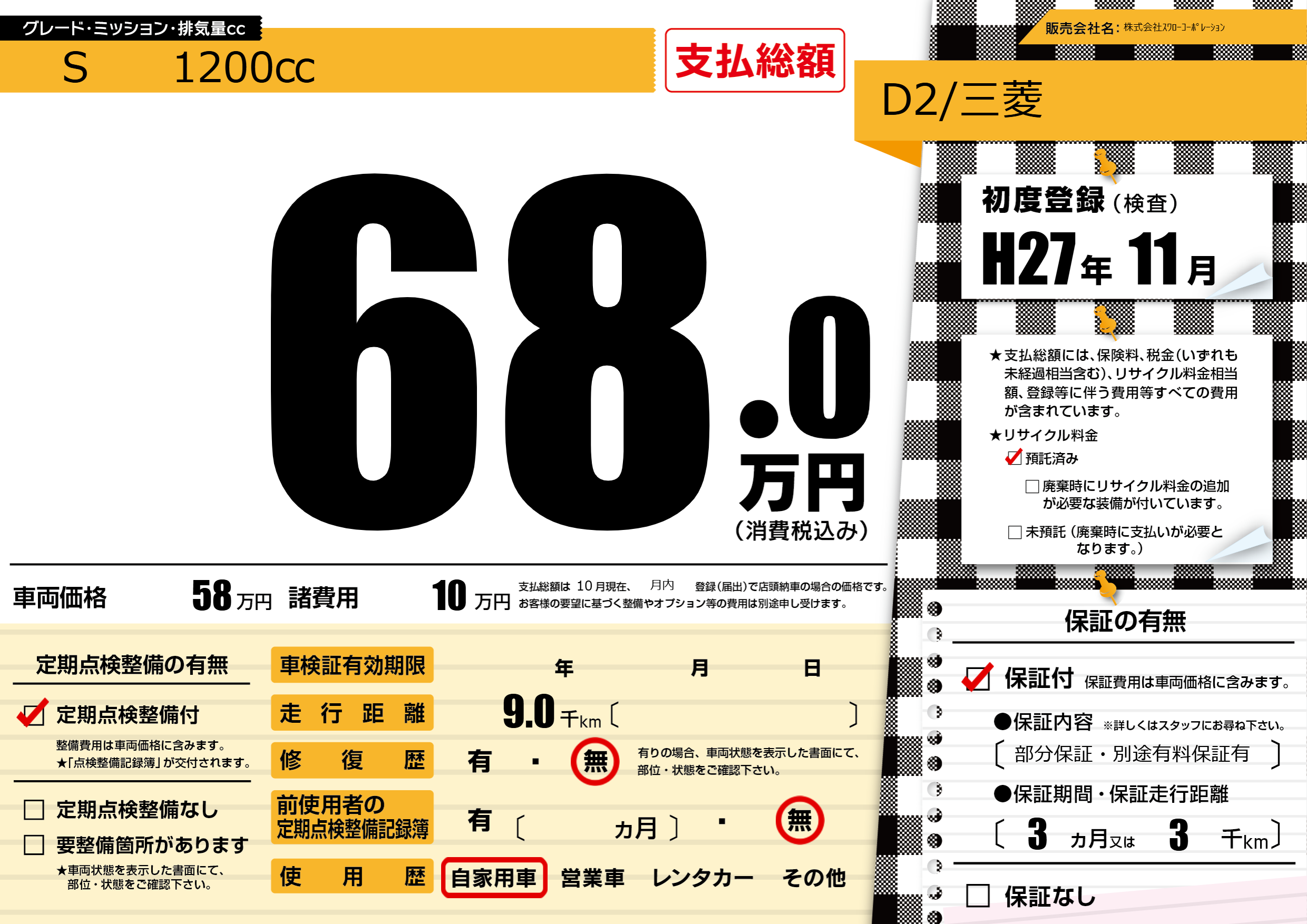 保証付き 保証内容(部分保証・別途有料保証有) 3ヶ月または(3)千kmまで |