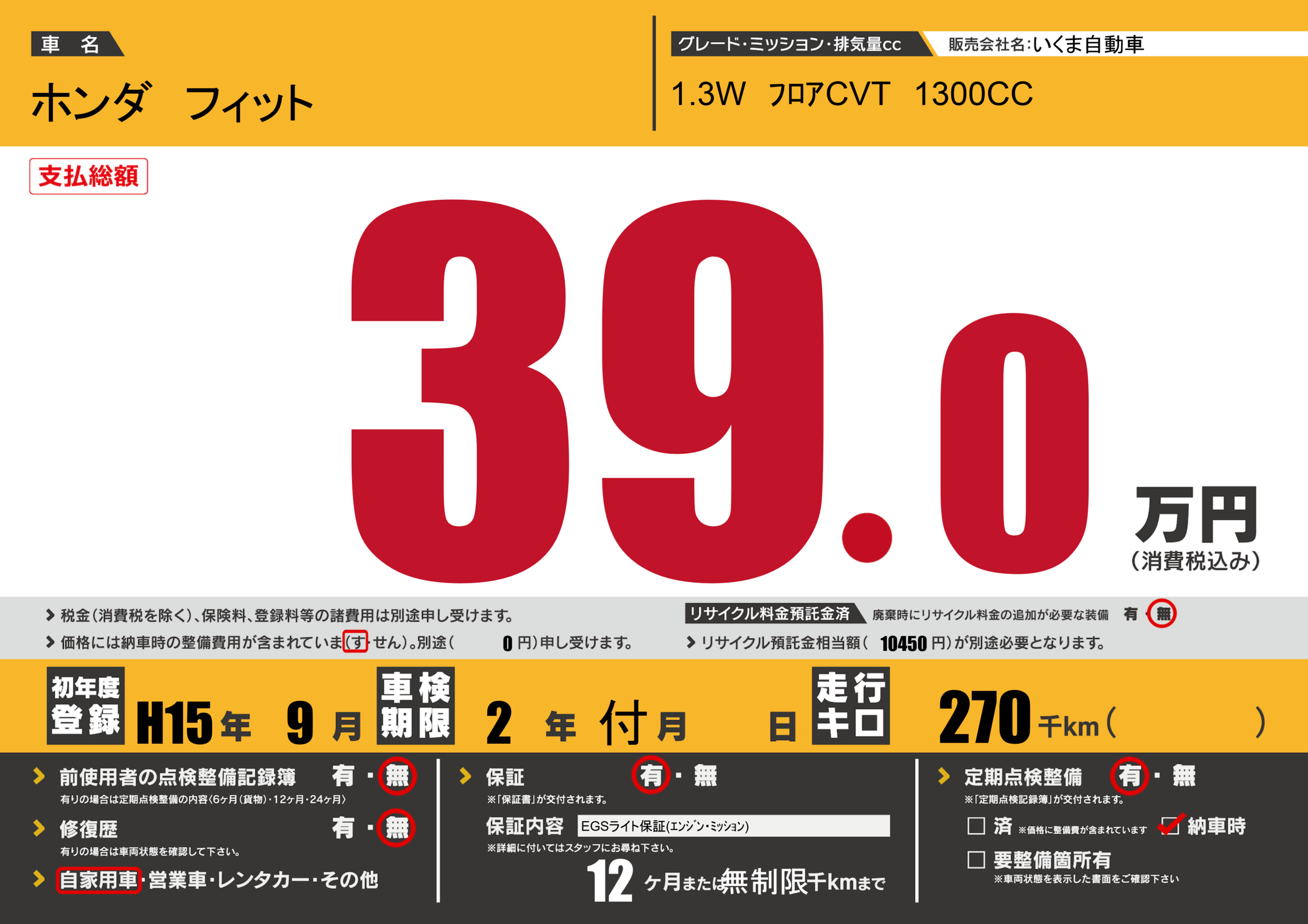 | 車名 | ホンダ フィット | グレード ミッション 排気量 |