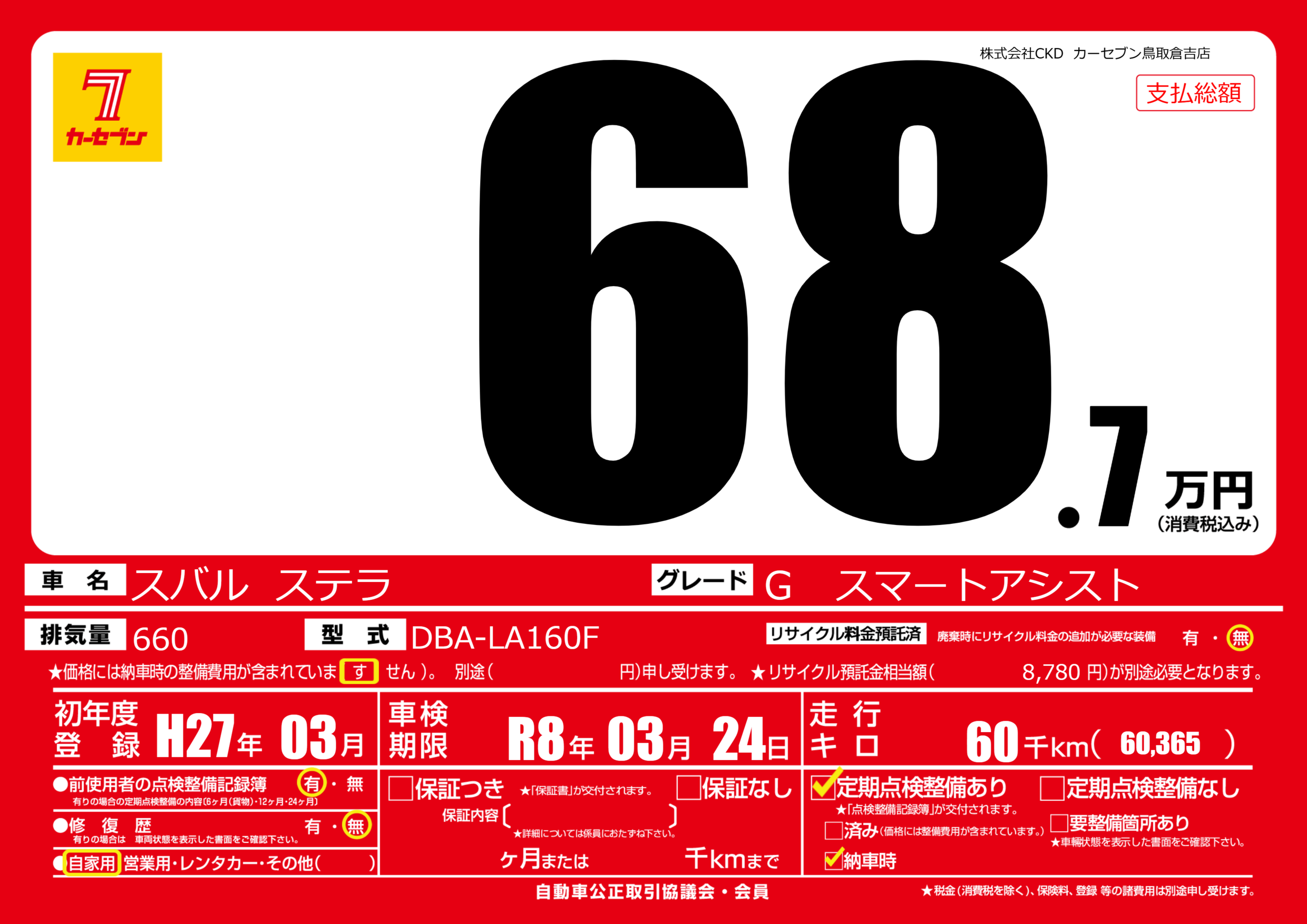 | 走行キロ | 6万km | 初年度登録 | H27年03月 |