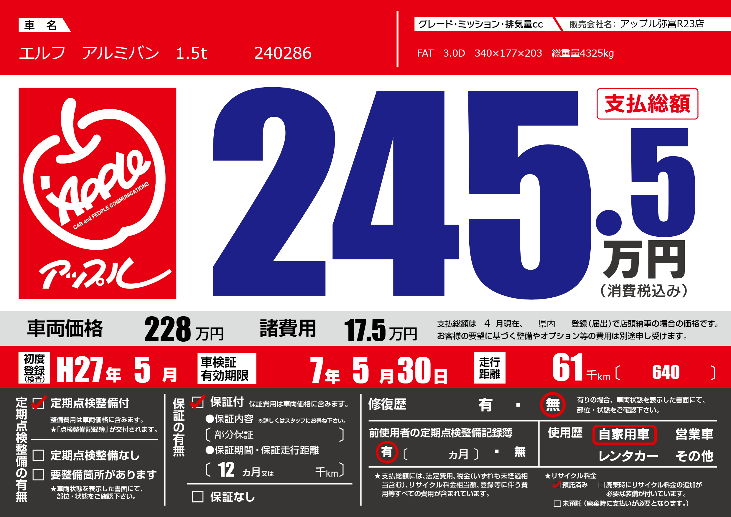 | 走行キロ | 6.1万km | 初年度登録 | H27年5月 |