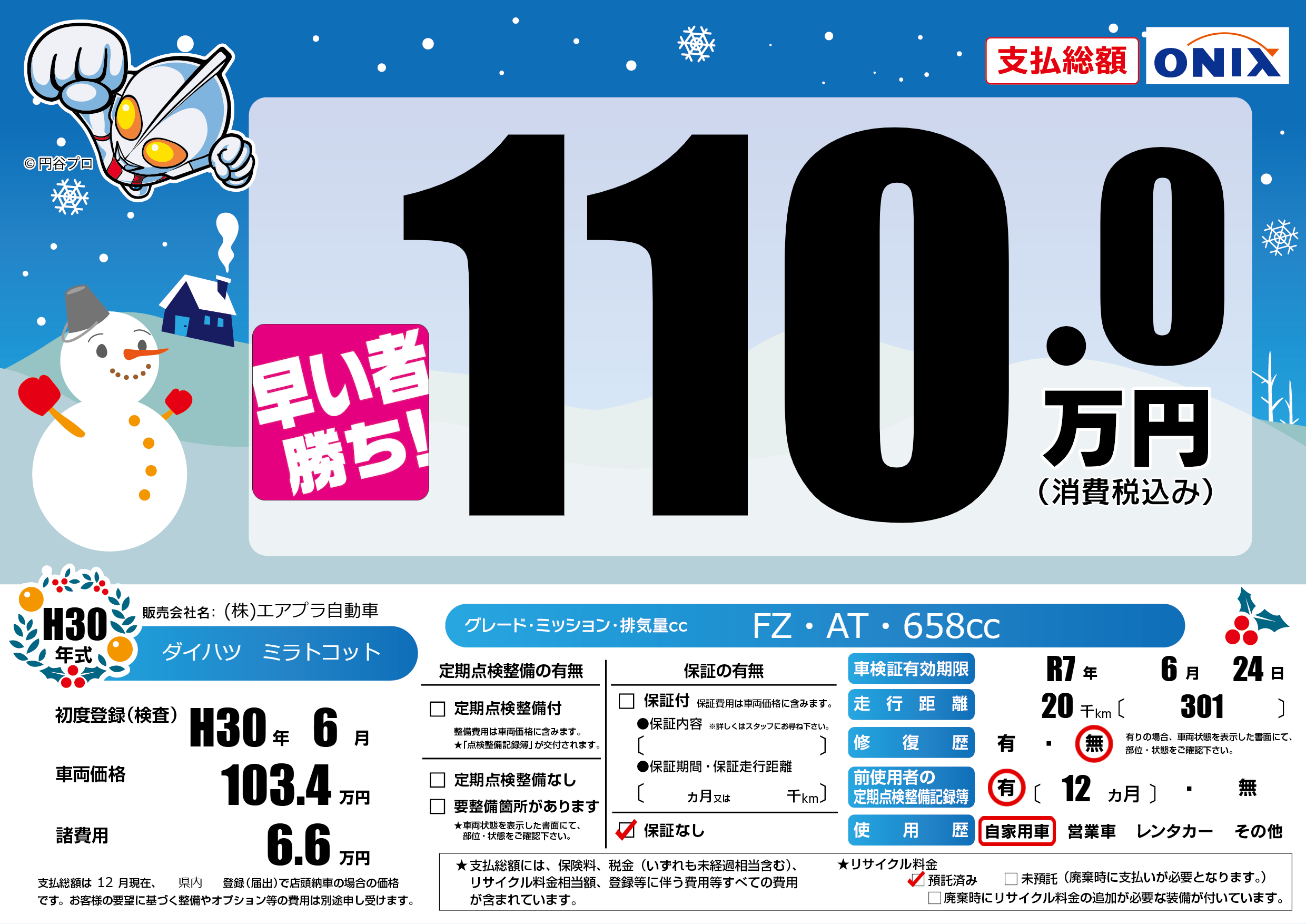 | 車名 | ダイハツ ミラトコット | グレード ミッション 排気量 |