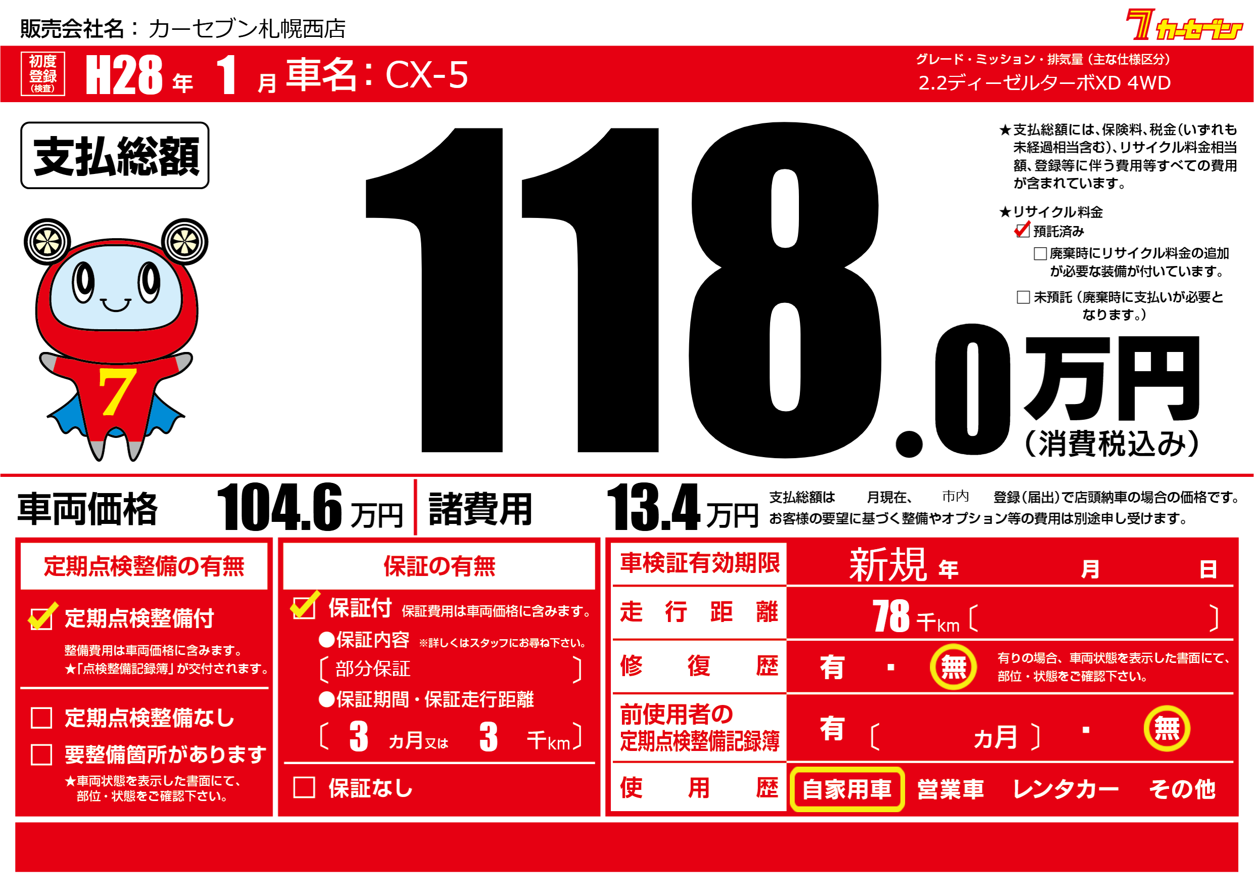 | 走行キロ | 7.8万km | 初年度登録 | H28年1月 |