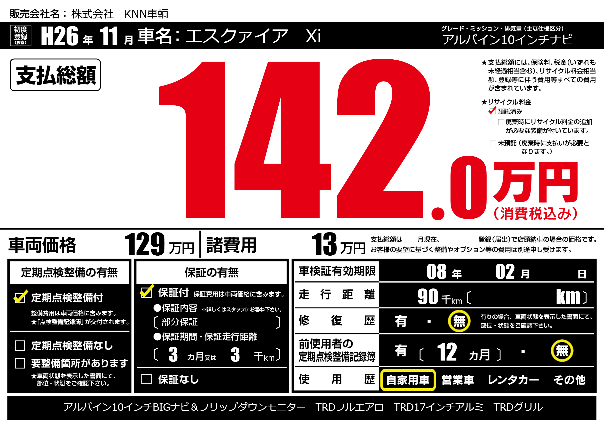 | 走行キロ | 9万km | 初年度登録 | H26年11月 |