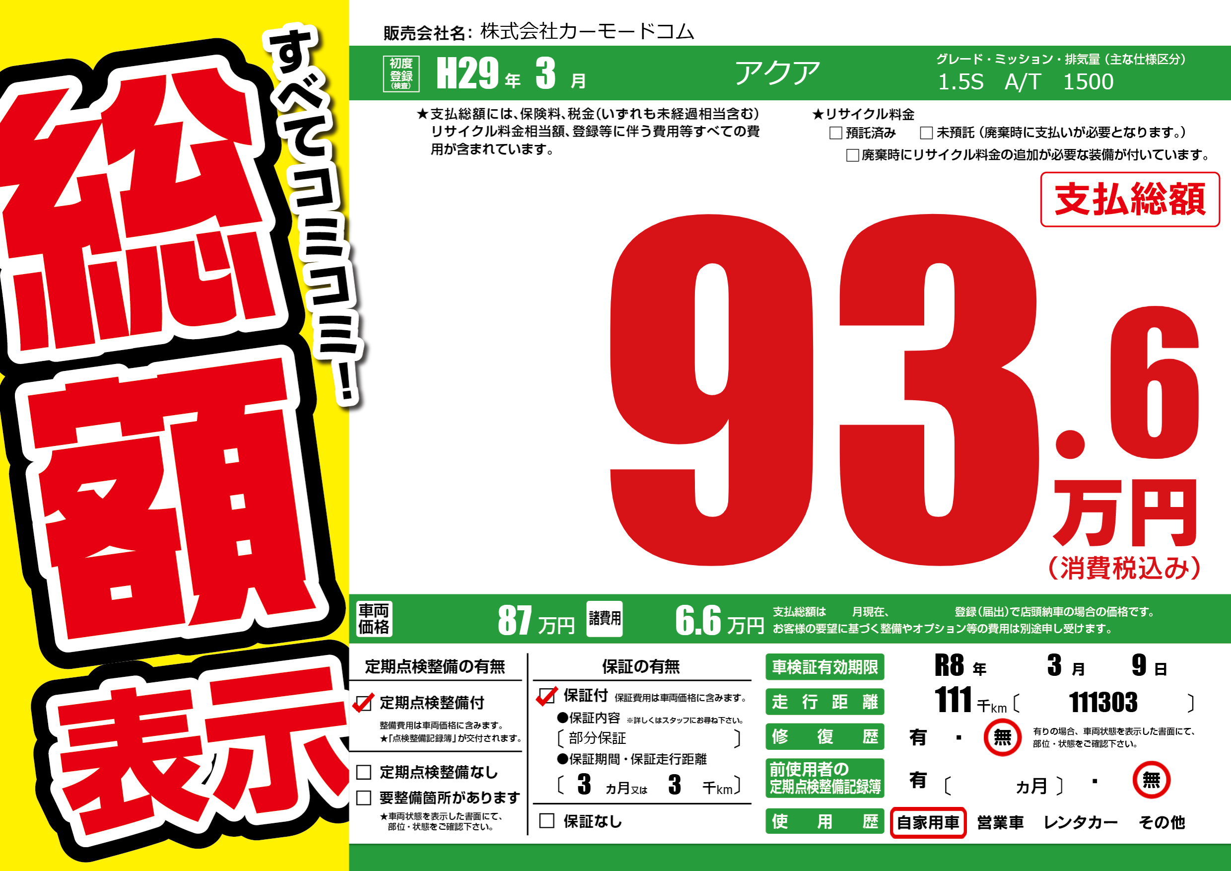 保証付き 保証内容(部分保証) 3ヶ月または(3)千kmまで |