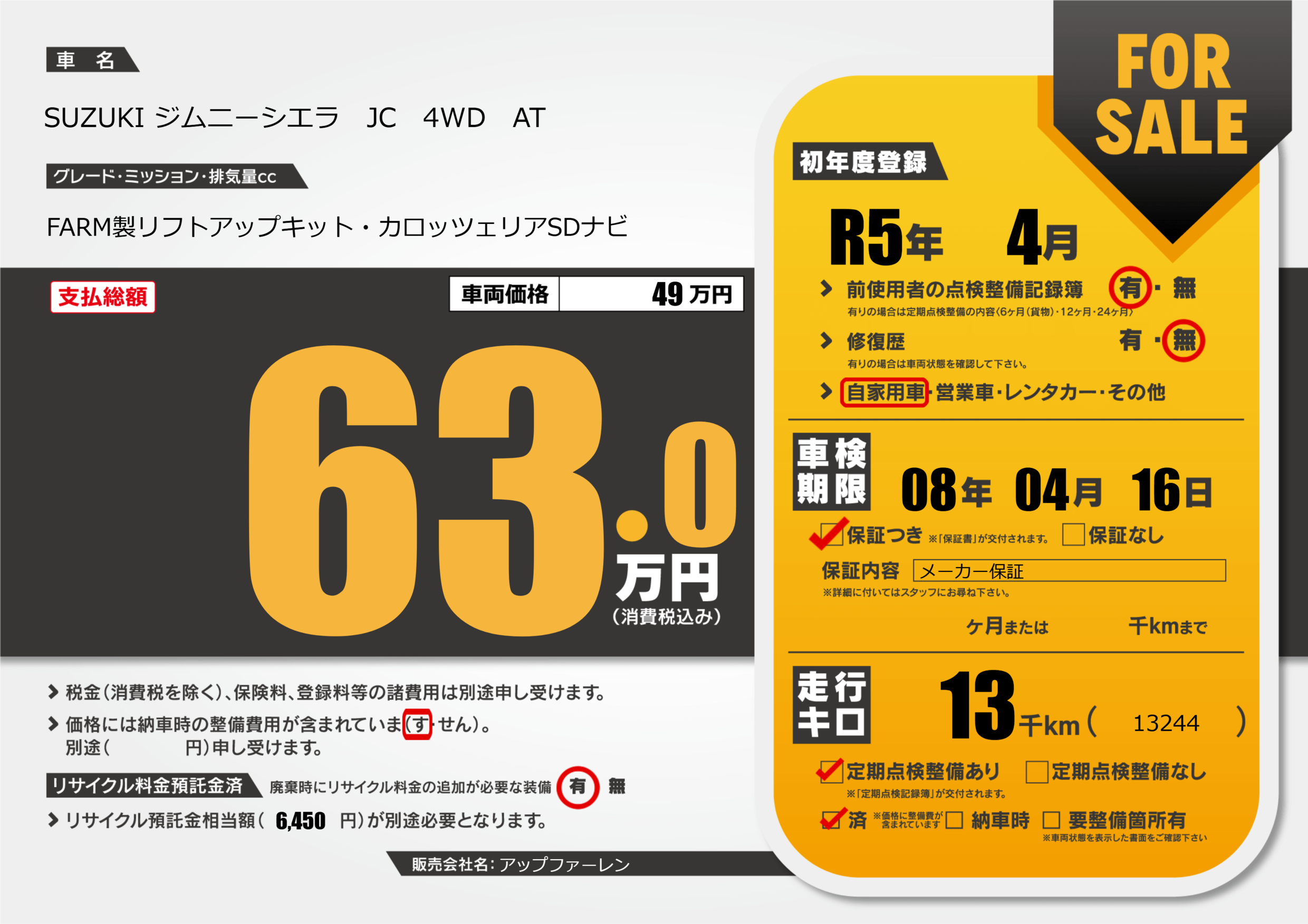 | 定期点検整備 | 定期点検整備あり 定期点検整備済み | ||