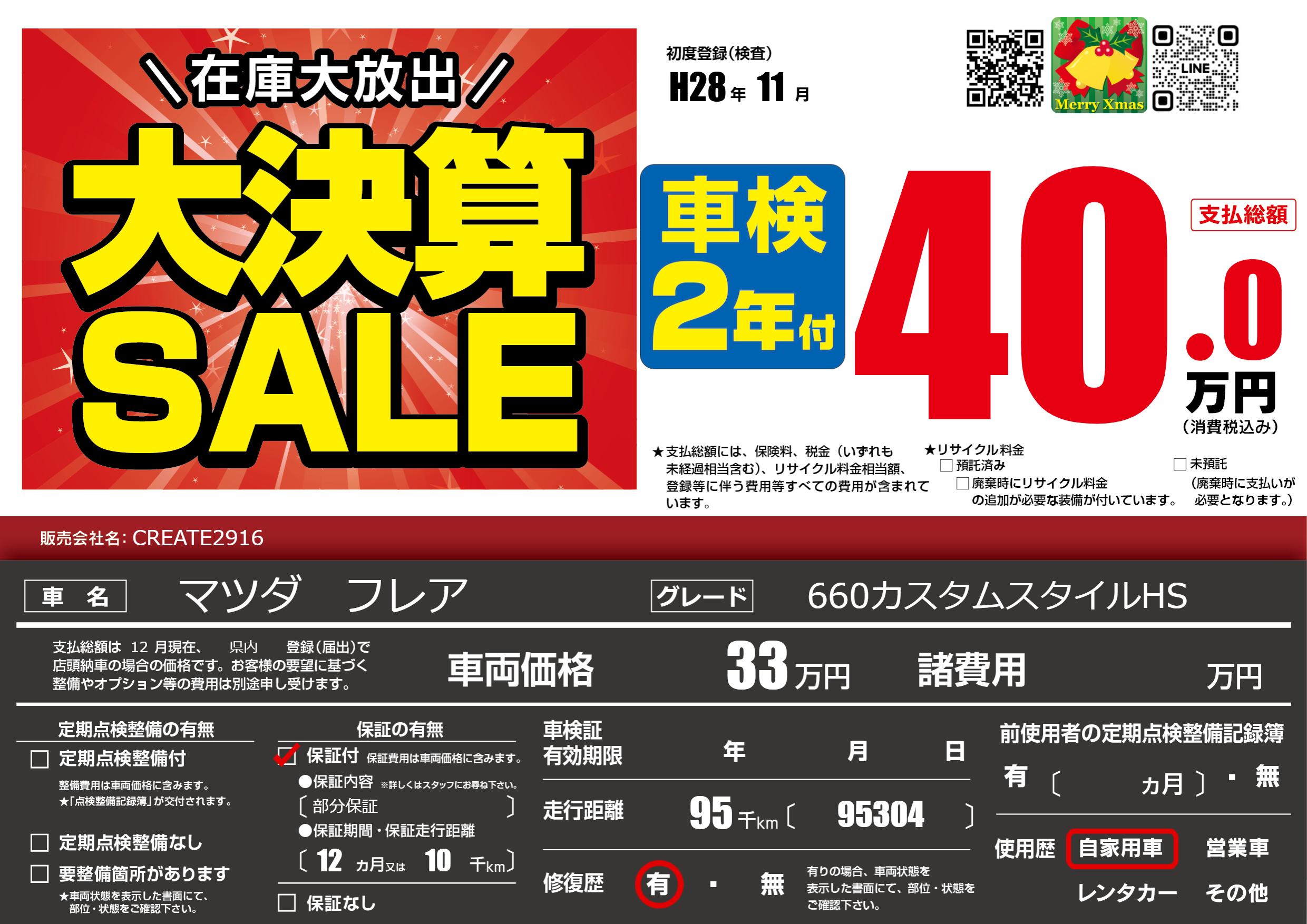 | 走行キロ | 9.5万km | 初年度登録 | H28年11月 |