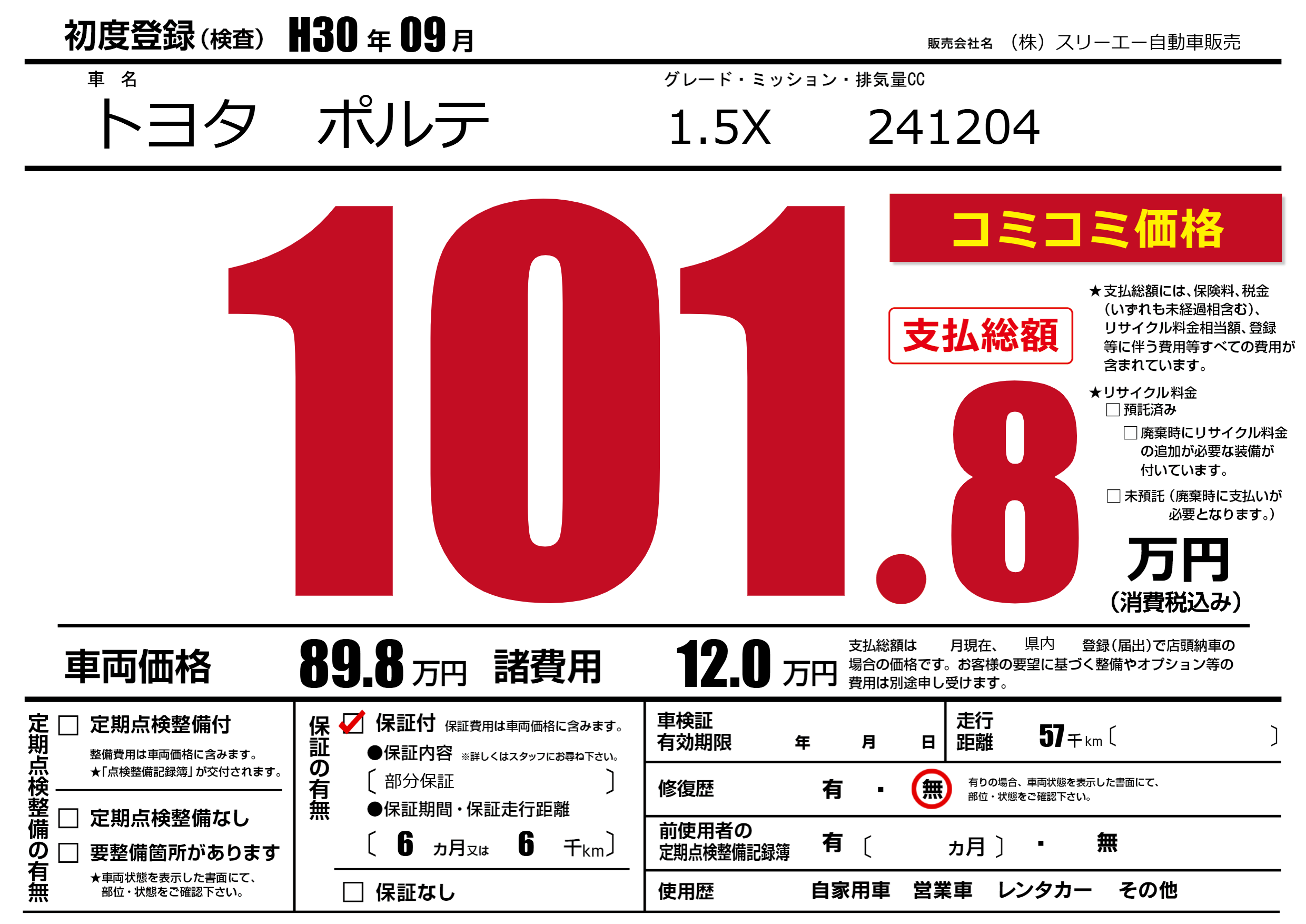 保証付き 保証内容(部分保証) 6ヶ月または(6)千kmまで |