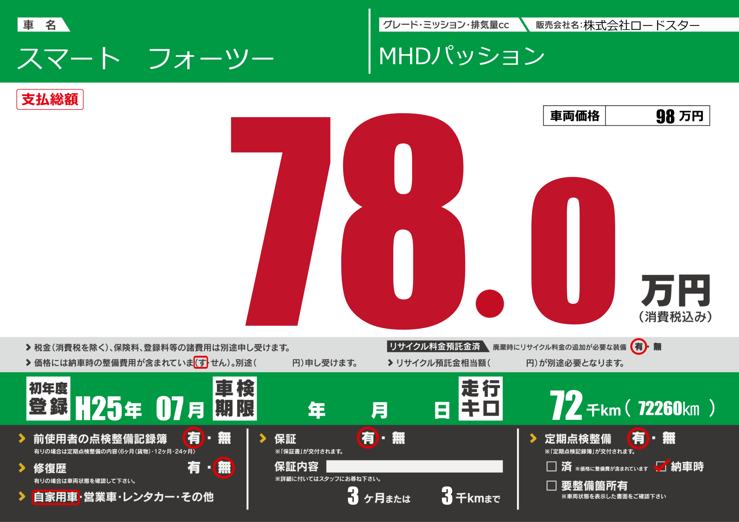 保証付き 保証内容(---) 3ヶ月または(3)千kmまで |