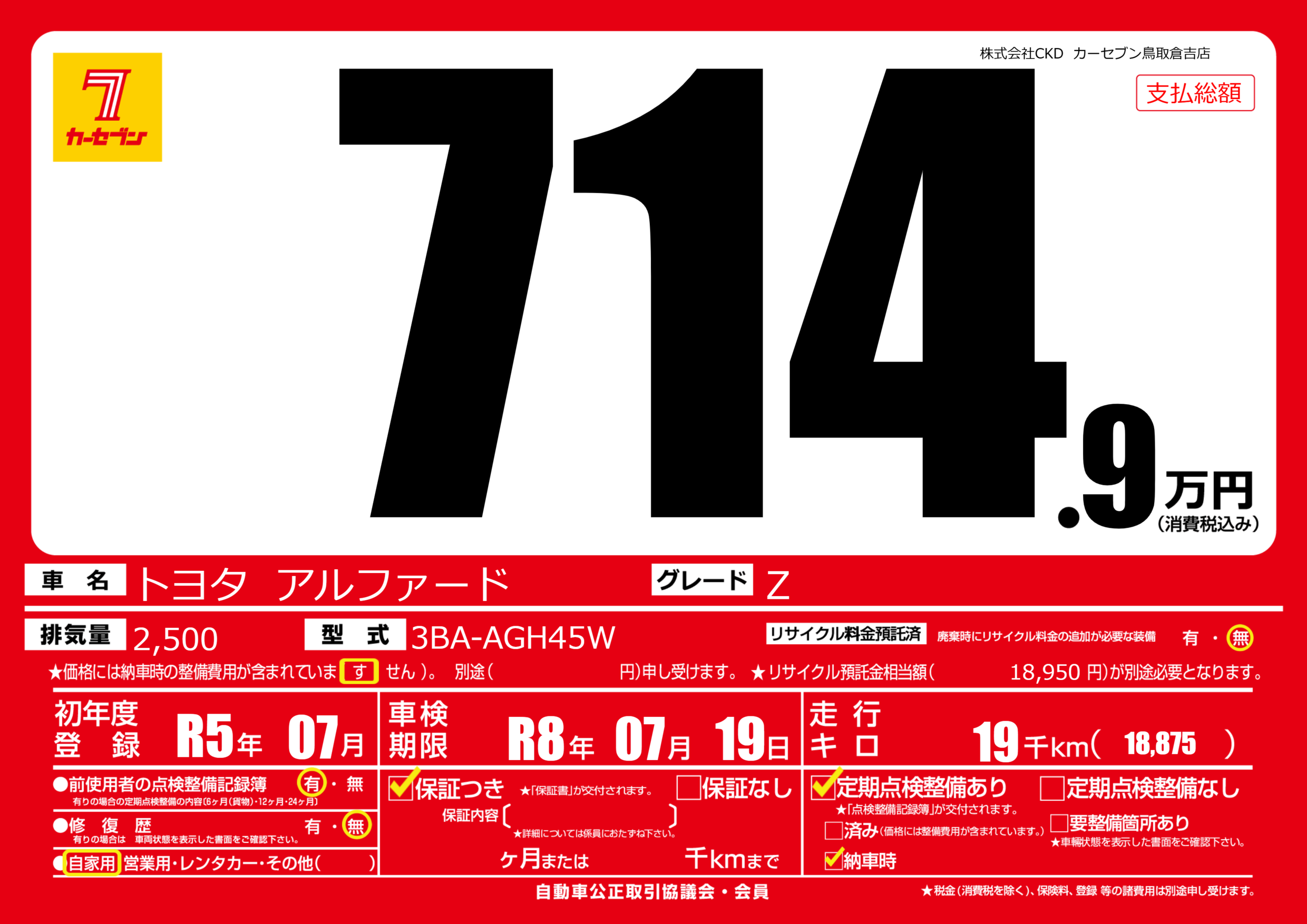 | 車名 | トヨタ アルファード | グレード ミッション 排気量 |