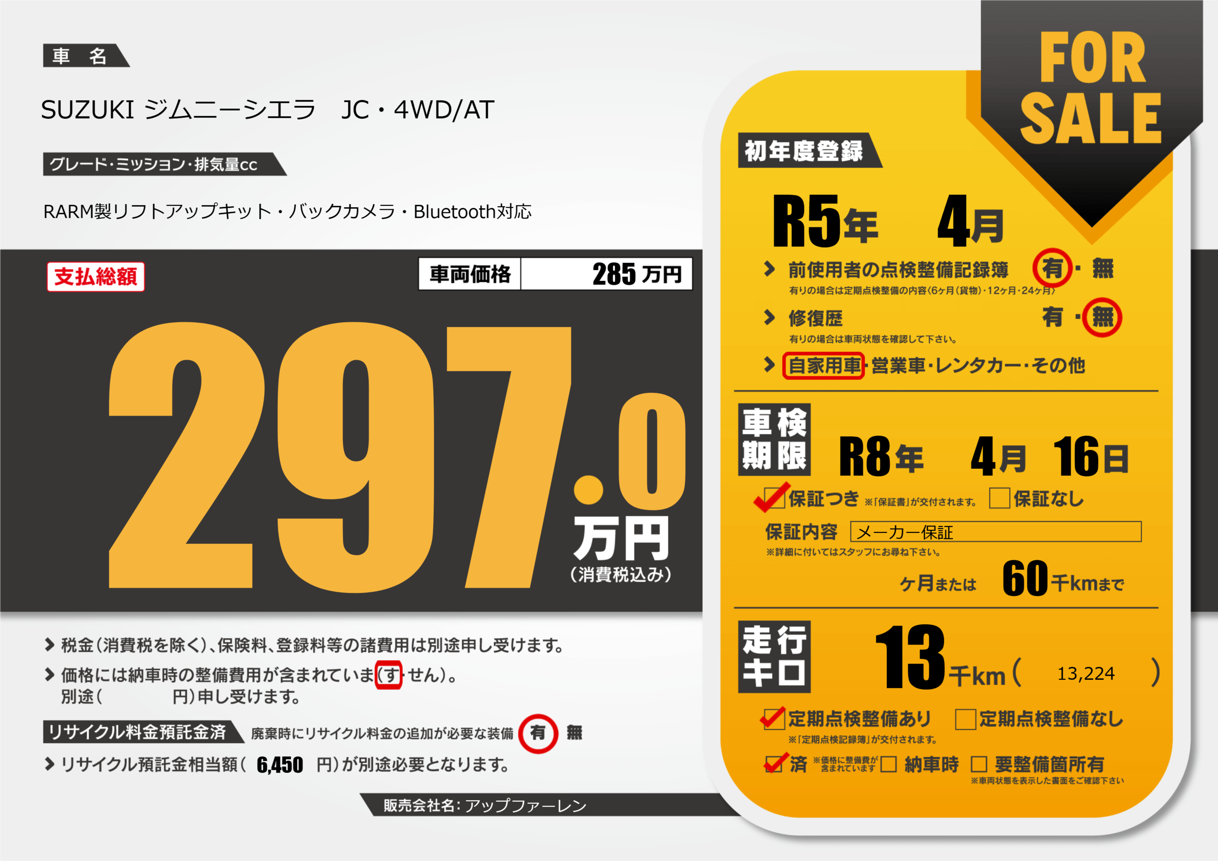 | 車名 | SUZUKI ジムニーシエラ JC・4WD/AT | グレード ミッション 排気量 |