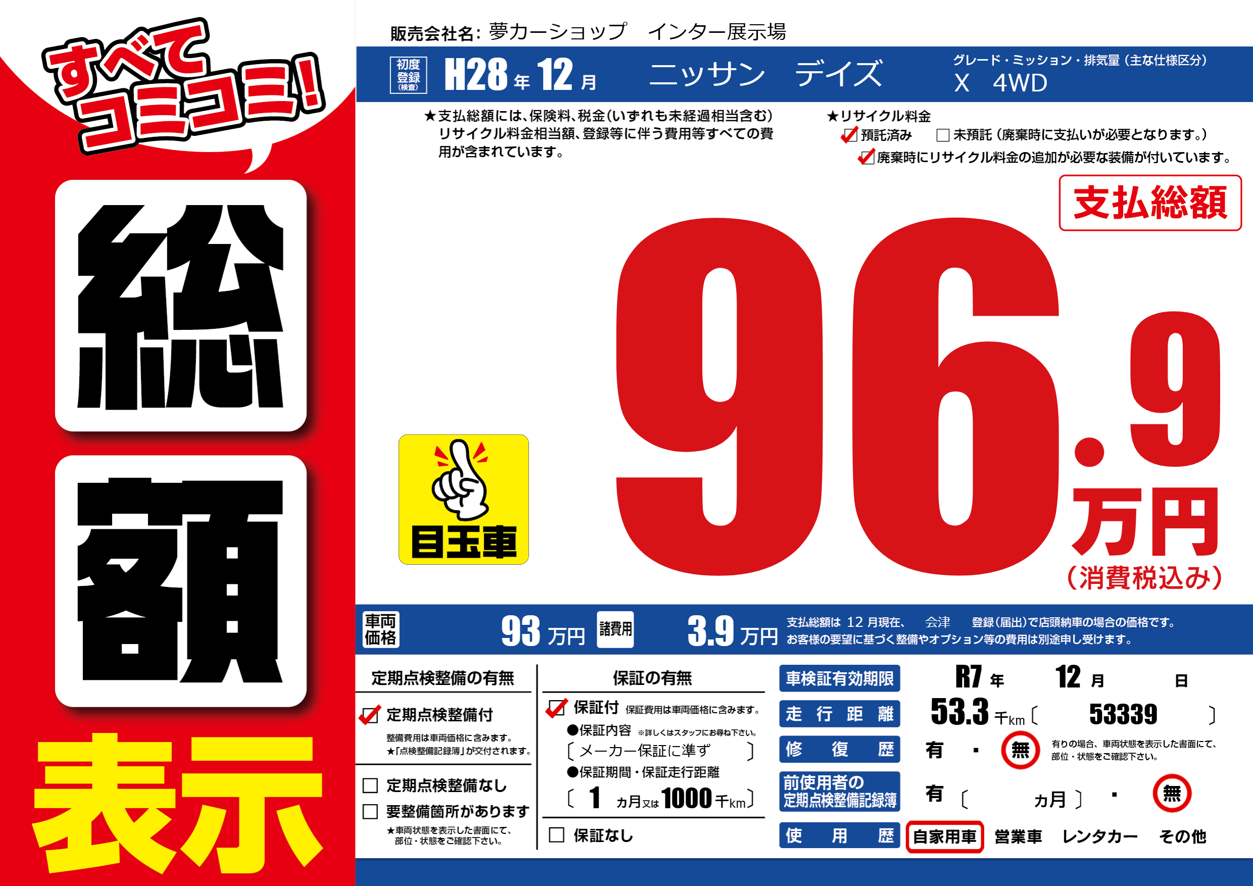 | 車名 | ニッサン デイズ | グレード ミッション 排気量 |