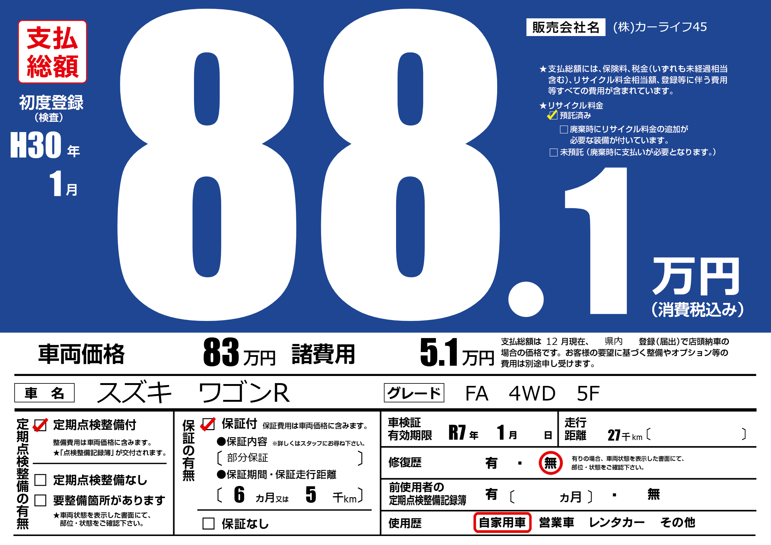 | 車名 | スズキ ワゴンR | グレード ミッション 排気量 |