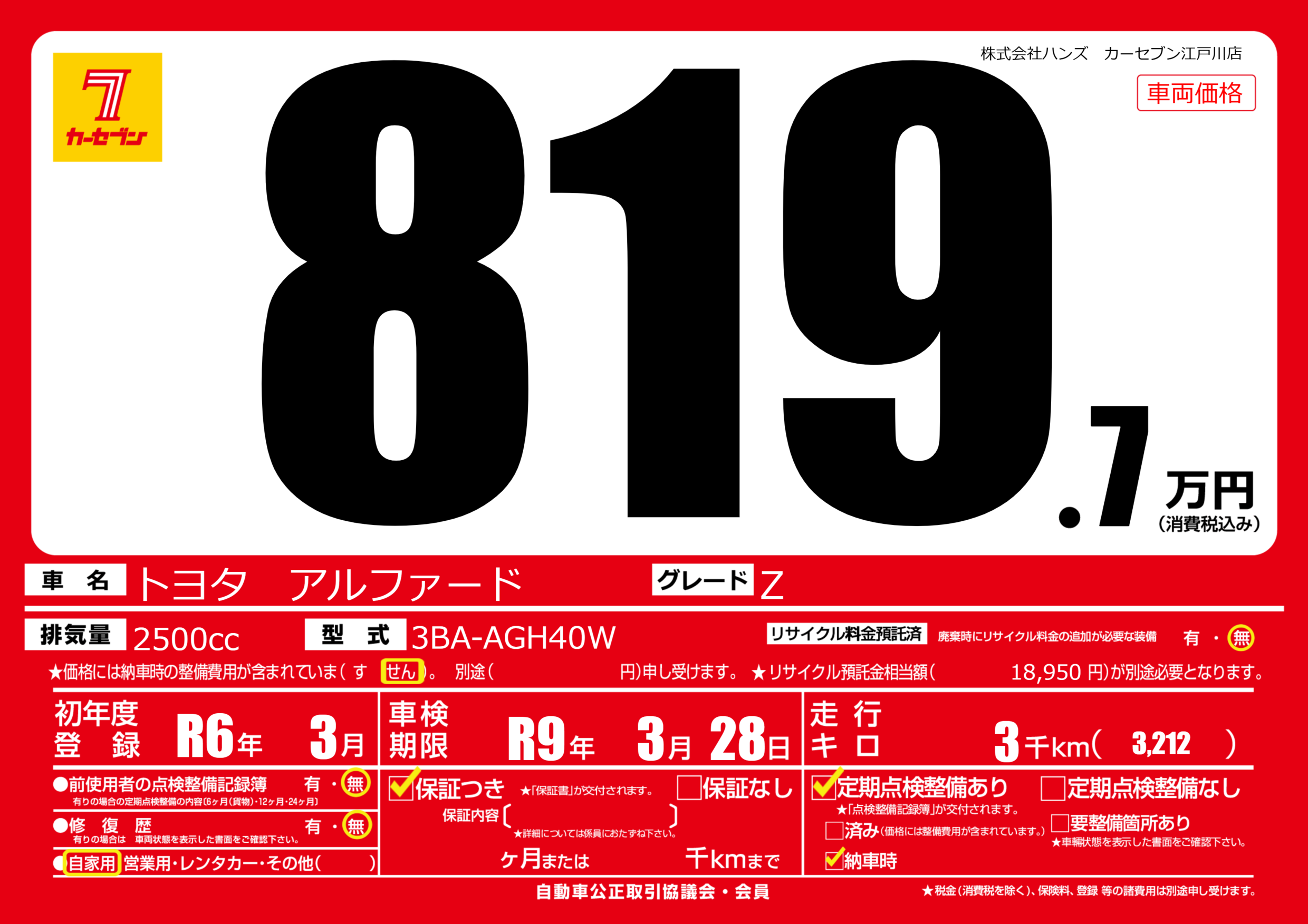 | 走行キロ | 0.3万km | 初年度登録 | R6年3月 |