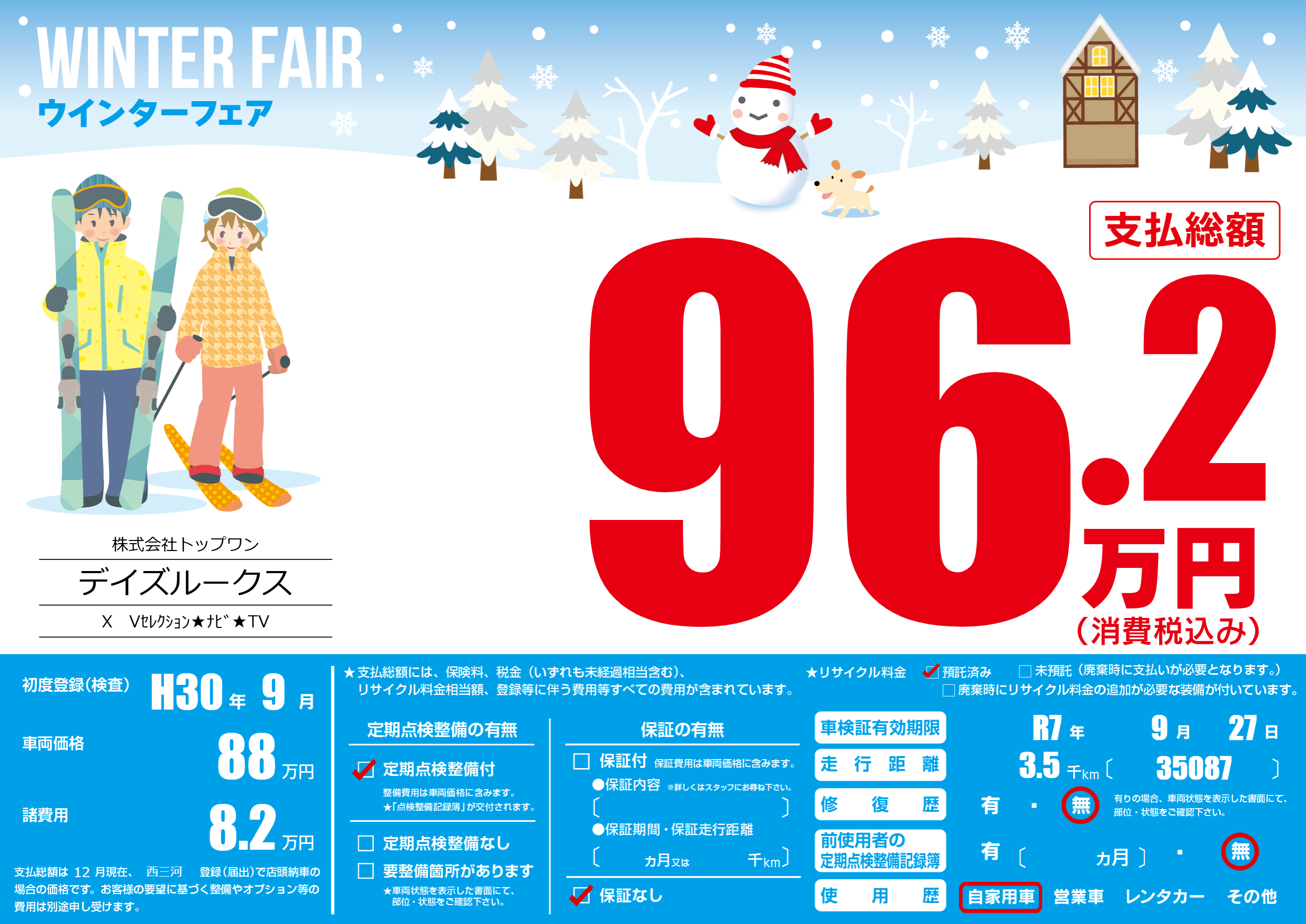 | 走行キロ | 0.3万km | 初年度登録 | H30年9月 |