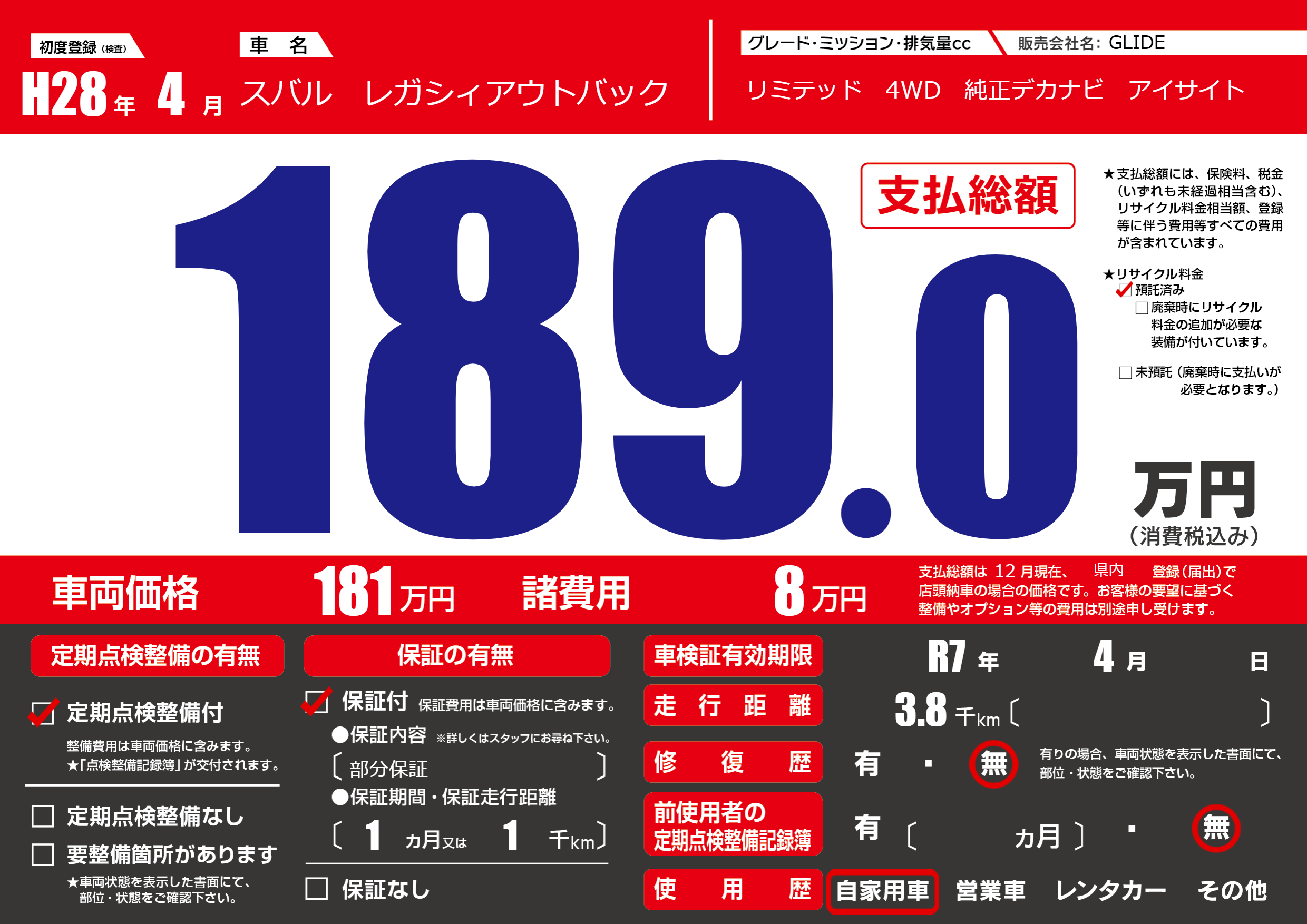 | 車検制限 | R7年 4月 - 日 | ||