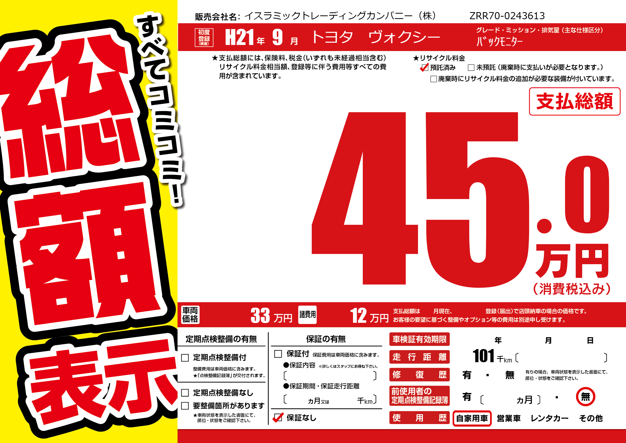 | 走行キロ | 10.1万km | 初年度登録 | H21年9月 |
