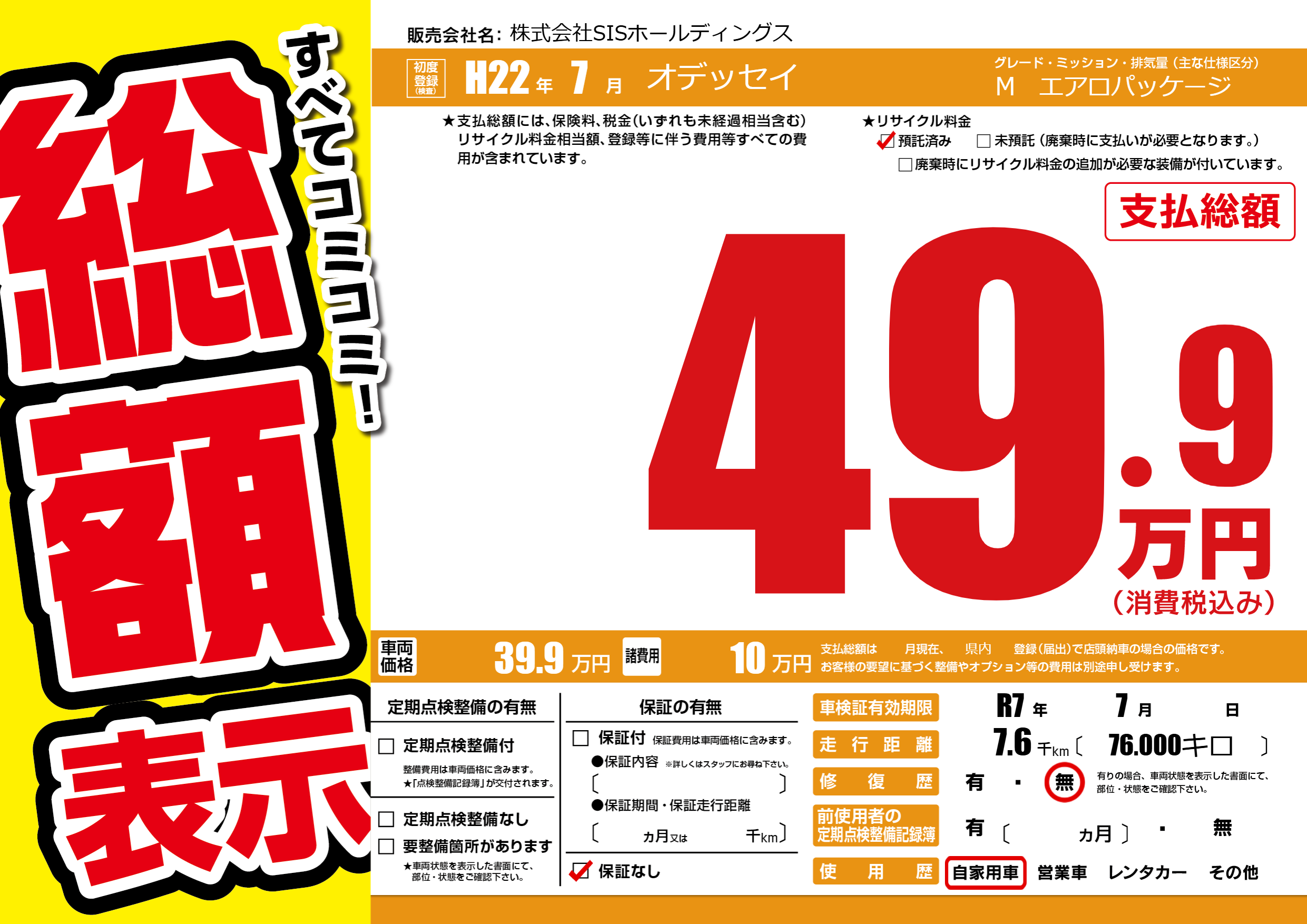 | 走行キロ | 0.7万km | 初年度登録 | H22年7月 |