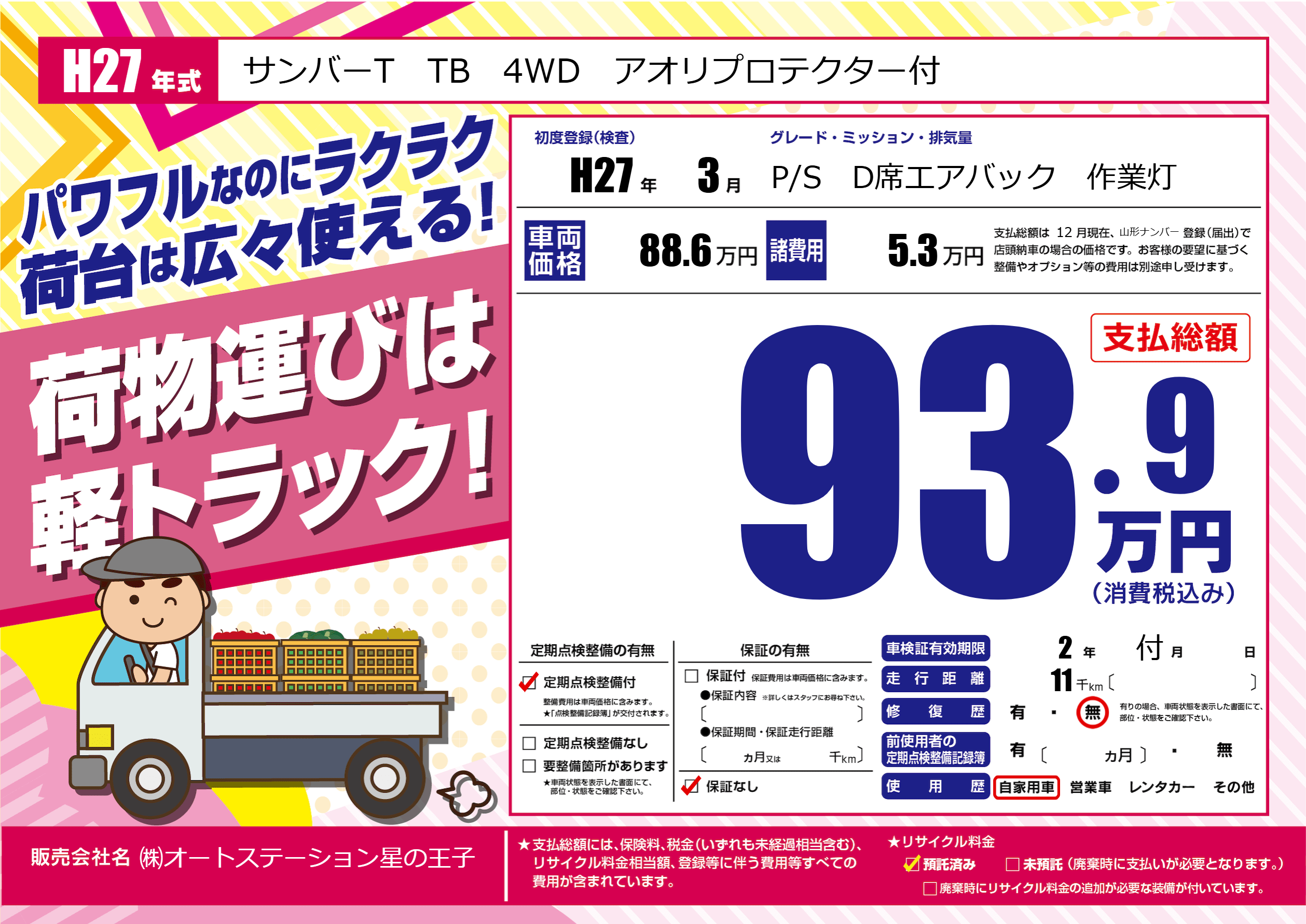 | 車名 | サンバーT TB 4WD アオリプロテクター付 | グレード ミッション 排気量 |
