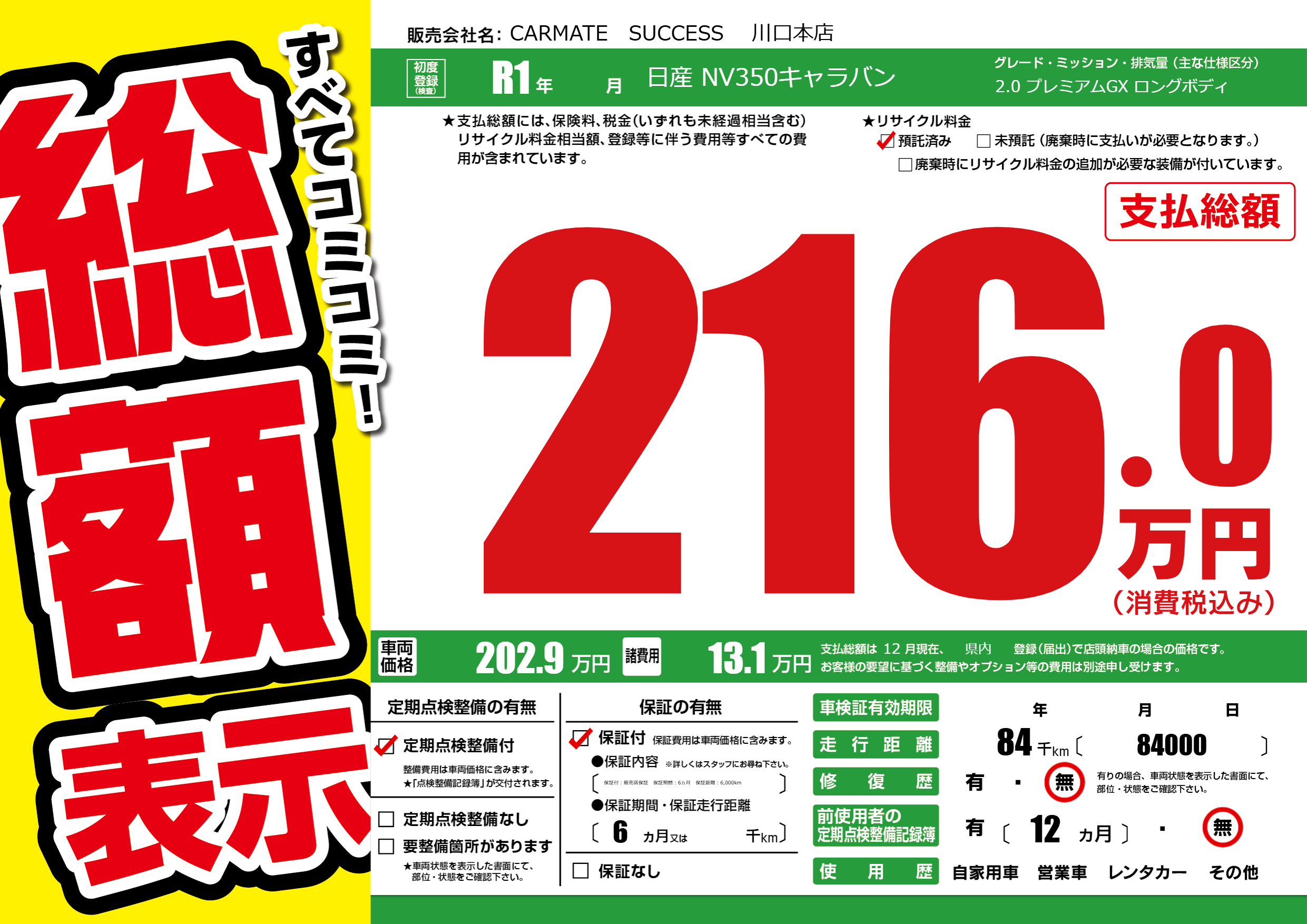 保証なし 保証内容(保証付:販売店保証 保証期間:6ヵ月 保証距離:6,000km) 6ヶ月または()千kmまで |