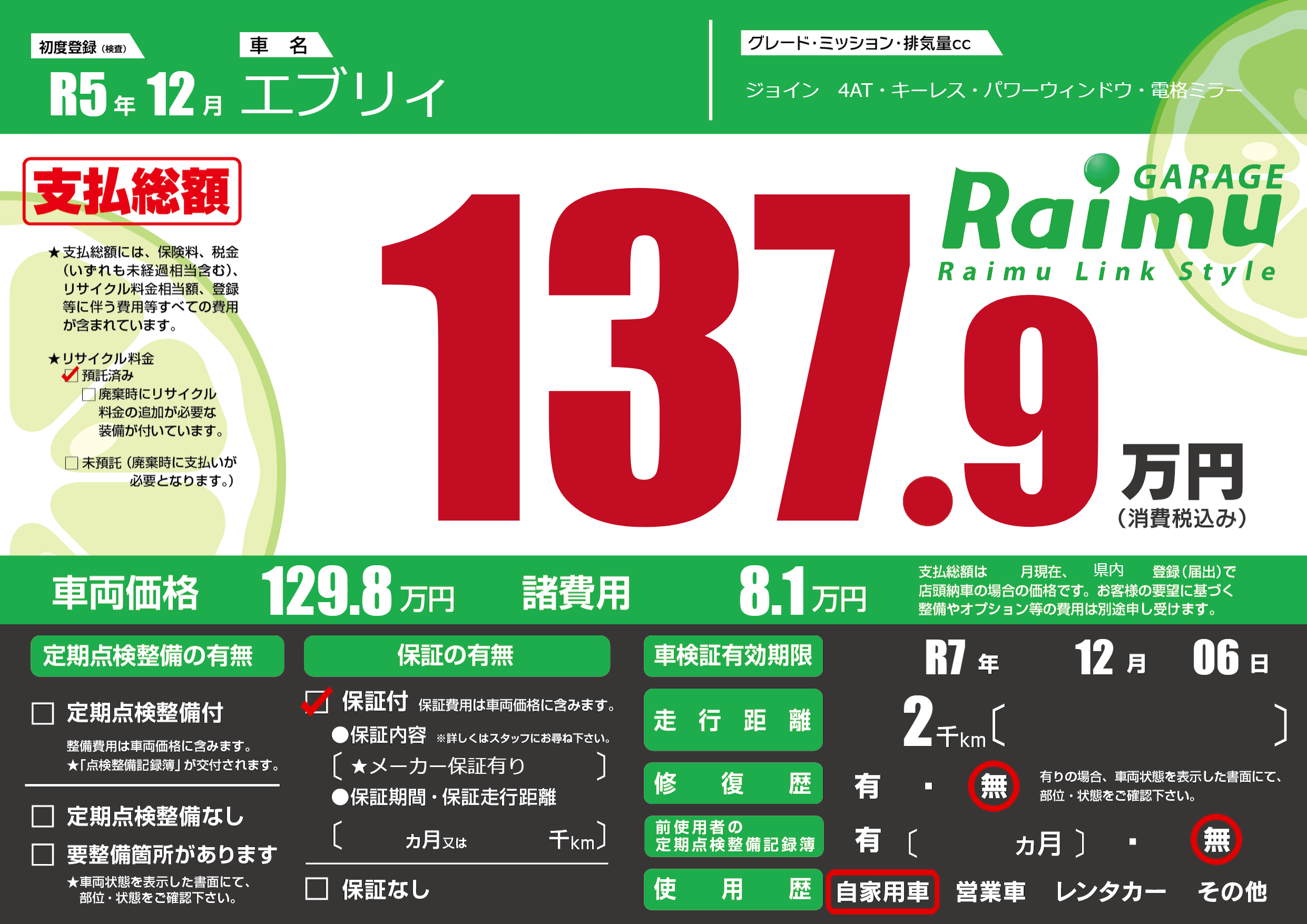 | 車名 | エブリィ | グレード ミッション 排気量 |