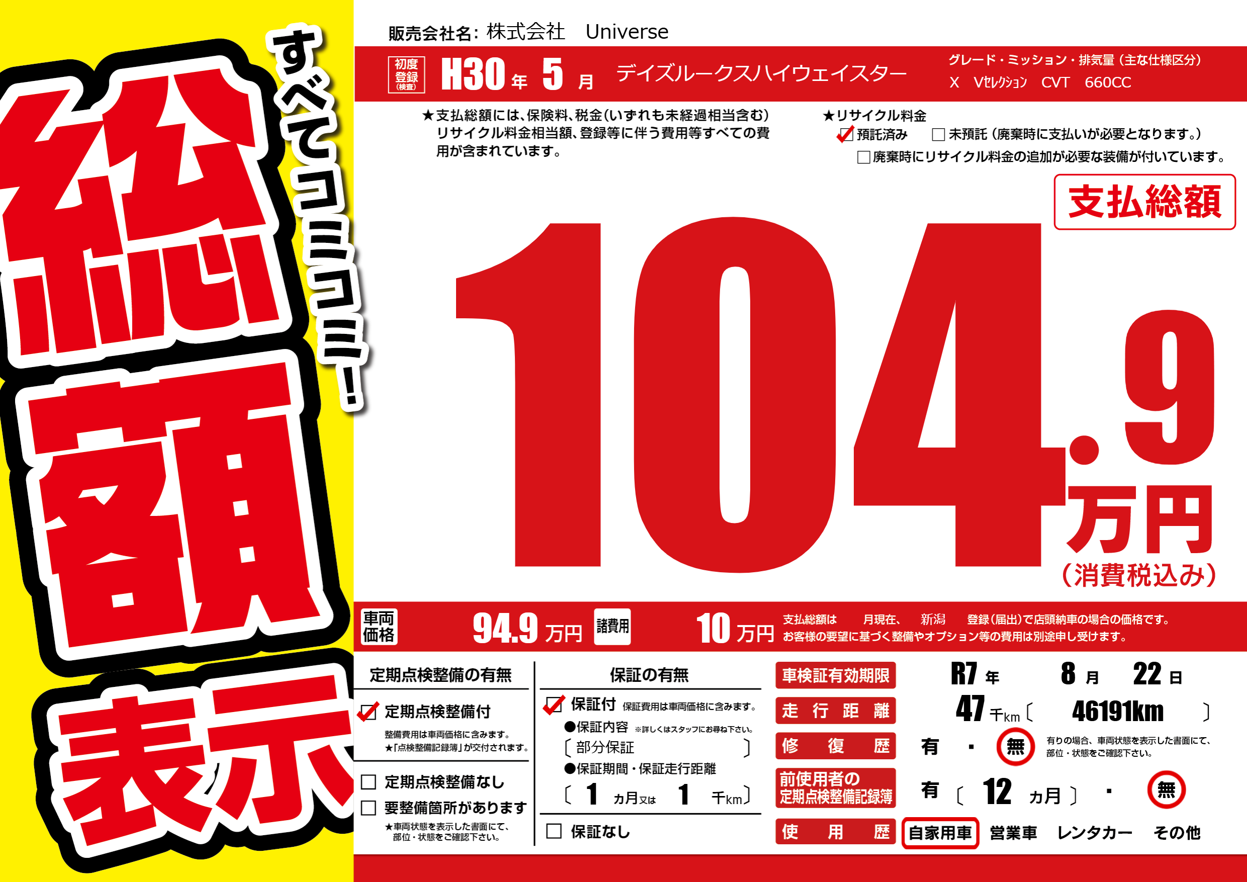 | 車検制限 | R7年 8月 22日 | ||