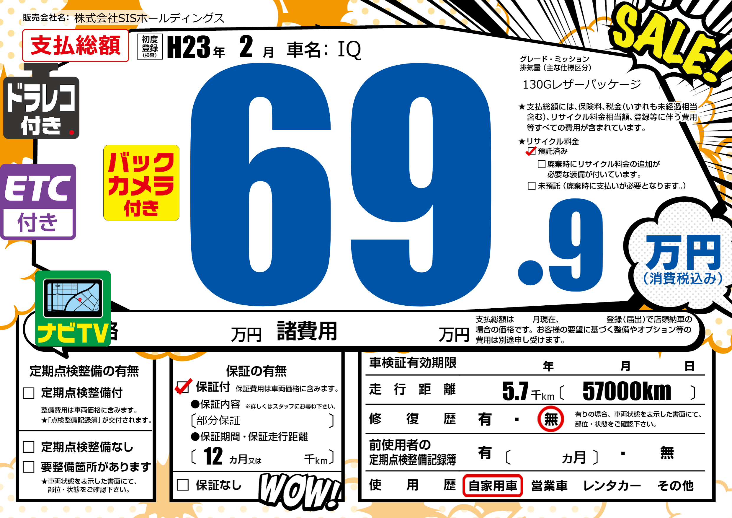 | 走行キロ | 0.5万km | 初年度登録 | H23年2月 |
