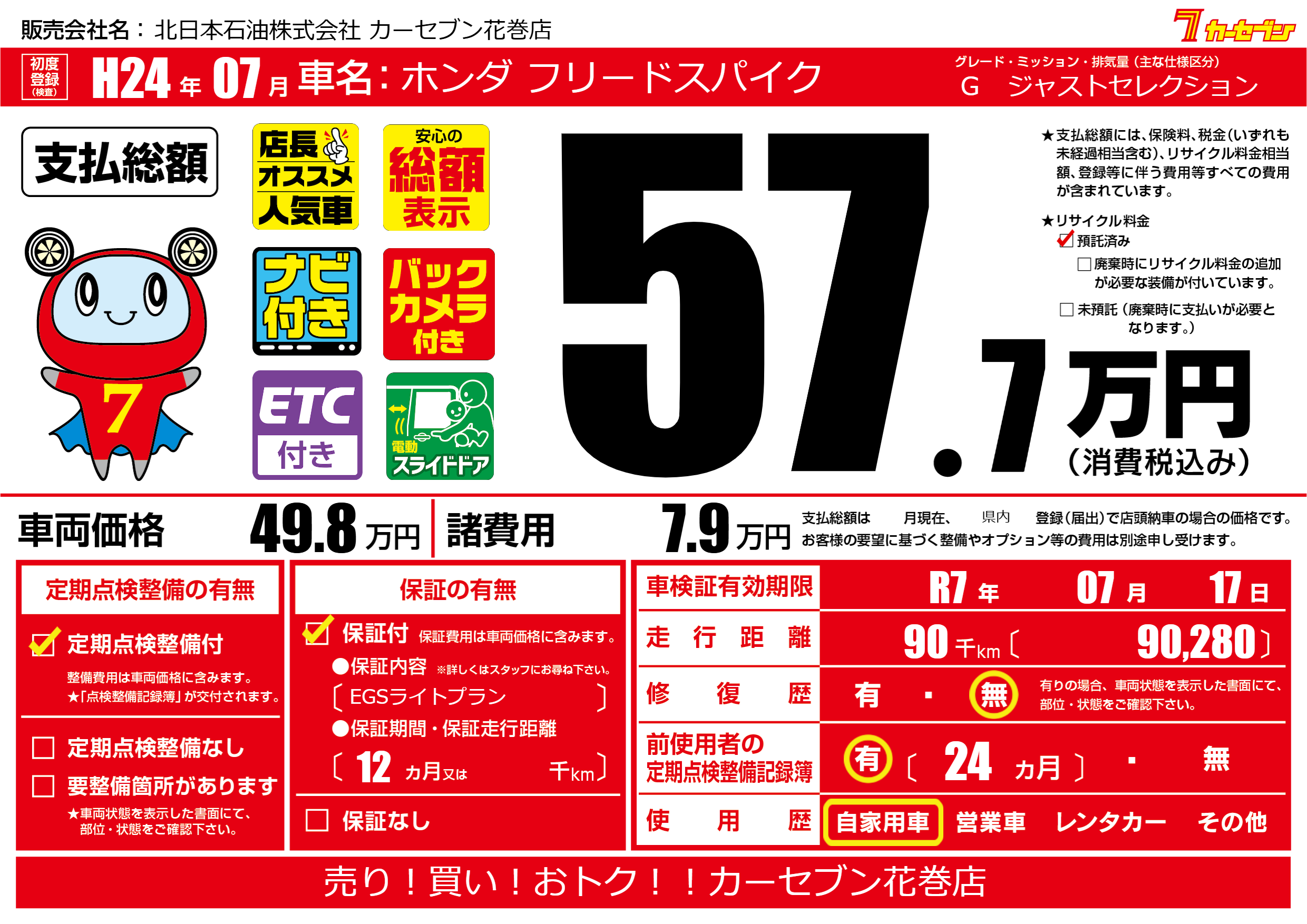 | 走行キロ | 9万km | 初年度登録 | H24年07月 |