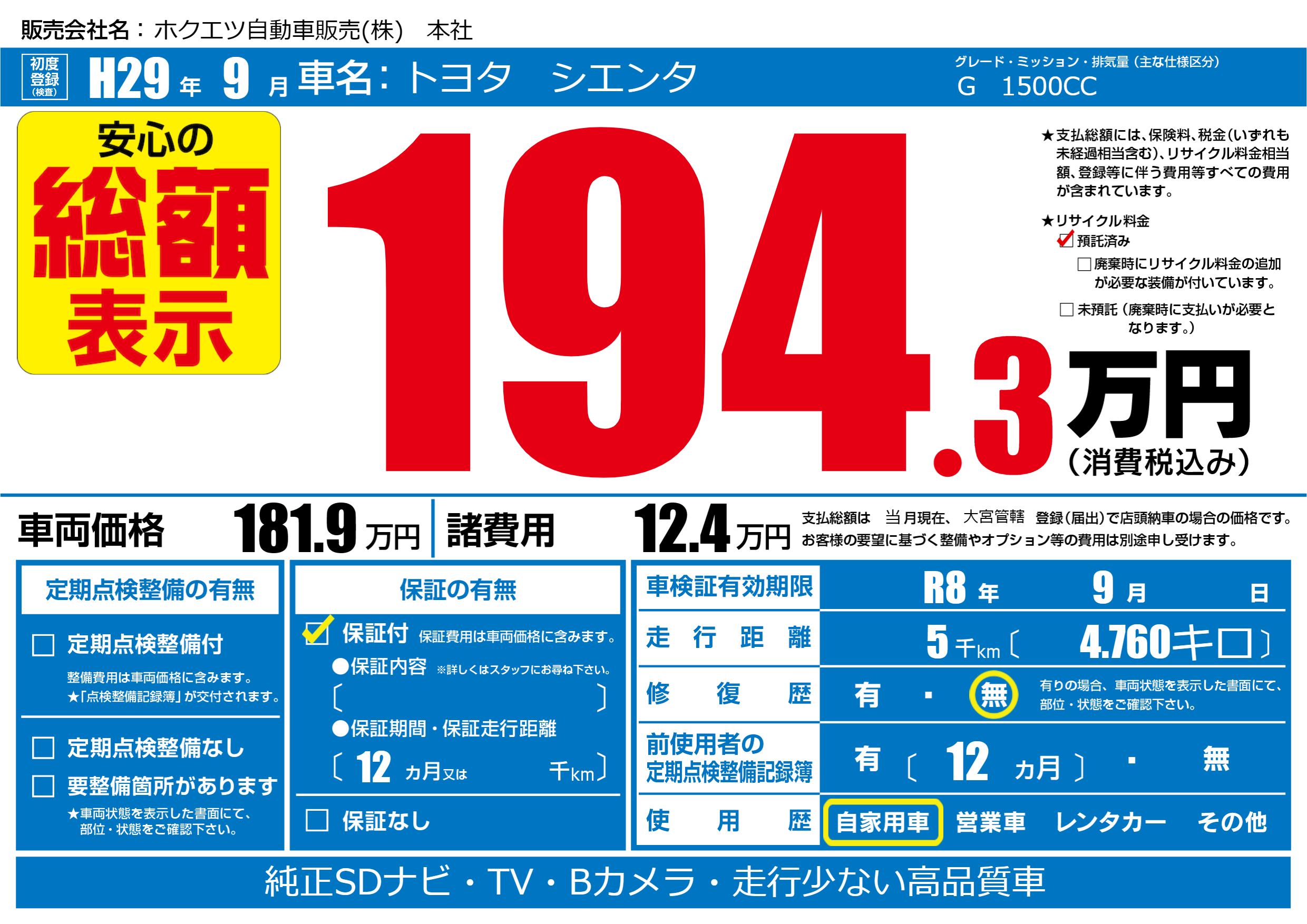 | 車名 | トヨタ シエンタ | グレード ミッション 排気量 |