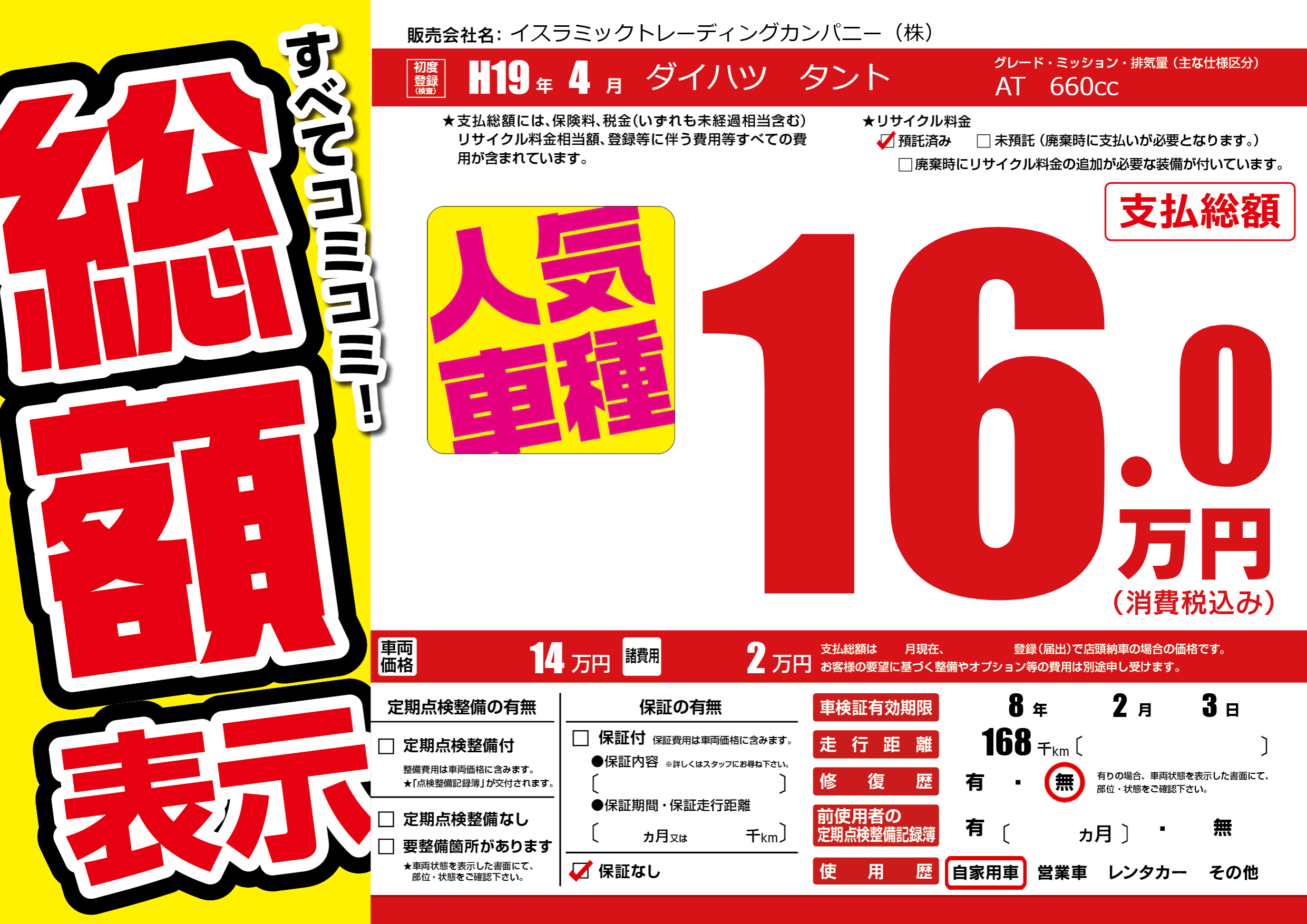 | 走行キロ | 16.8万km | 初年度登録 | H19年4月 |
