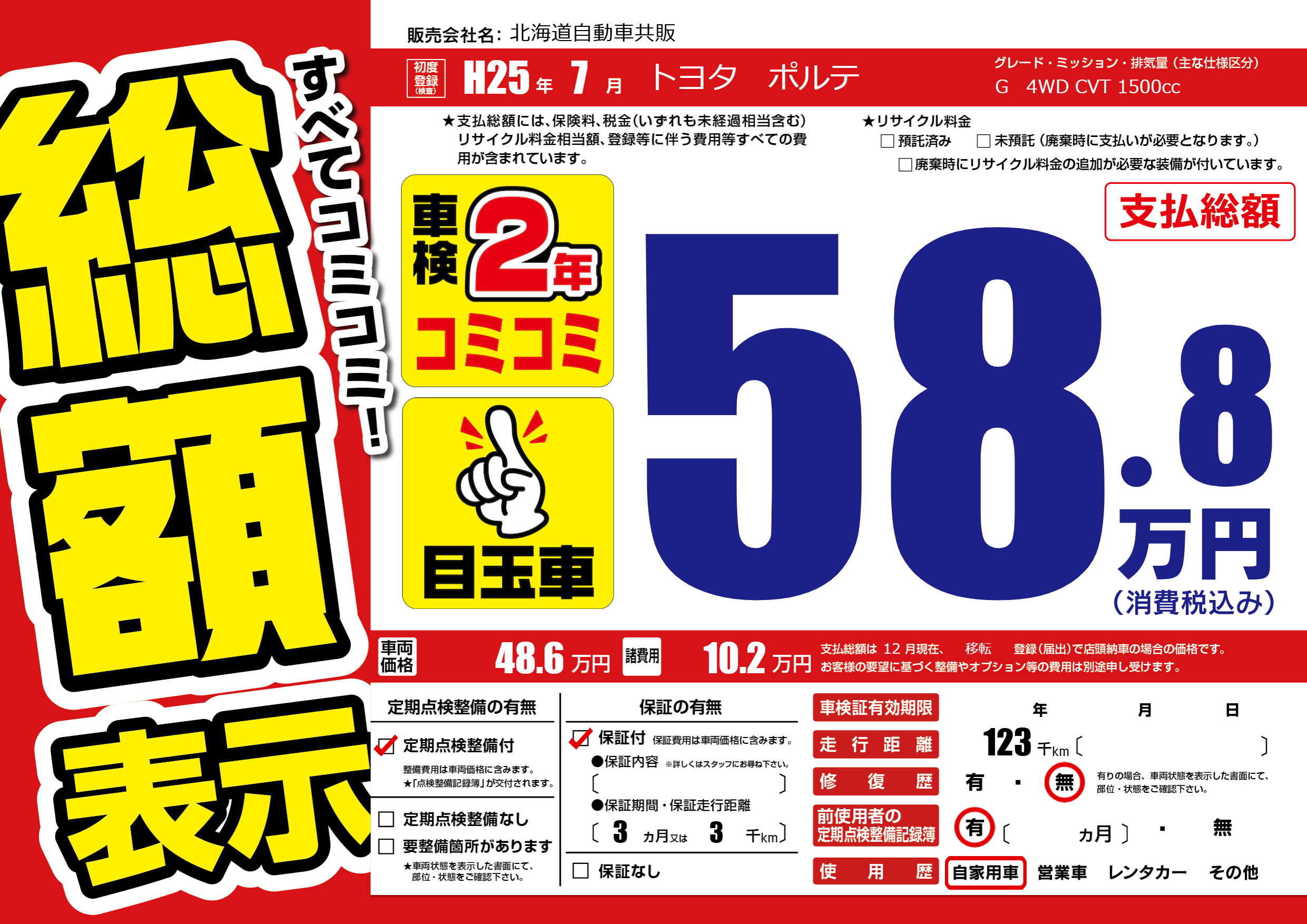 | 走行キロ | 12.3万km | 初年度登録 | H25年7月 |