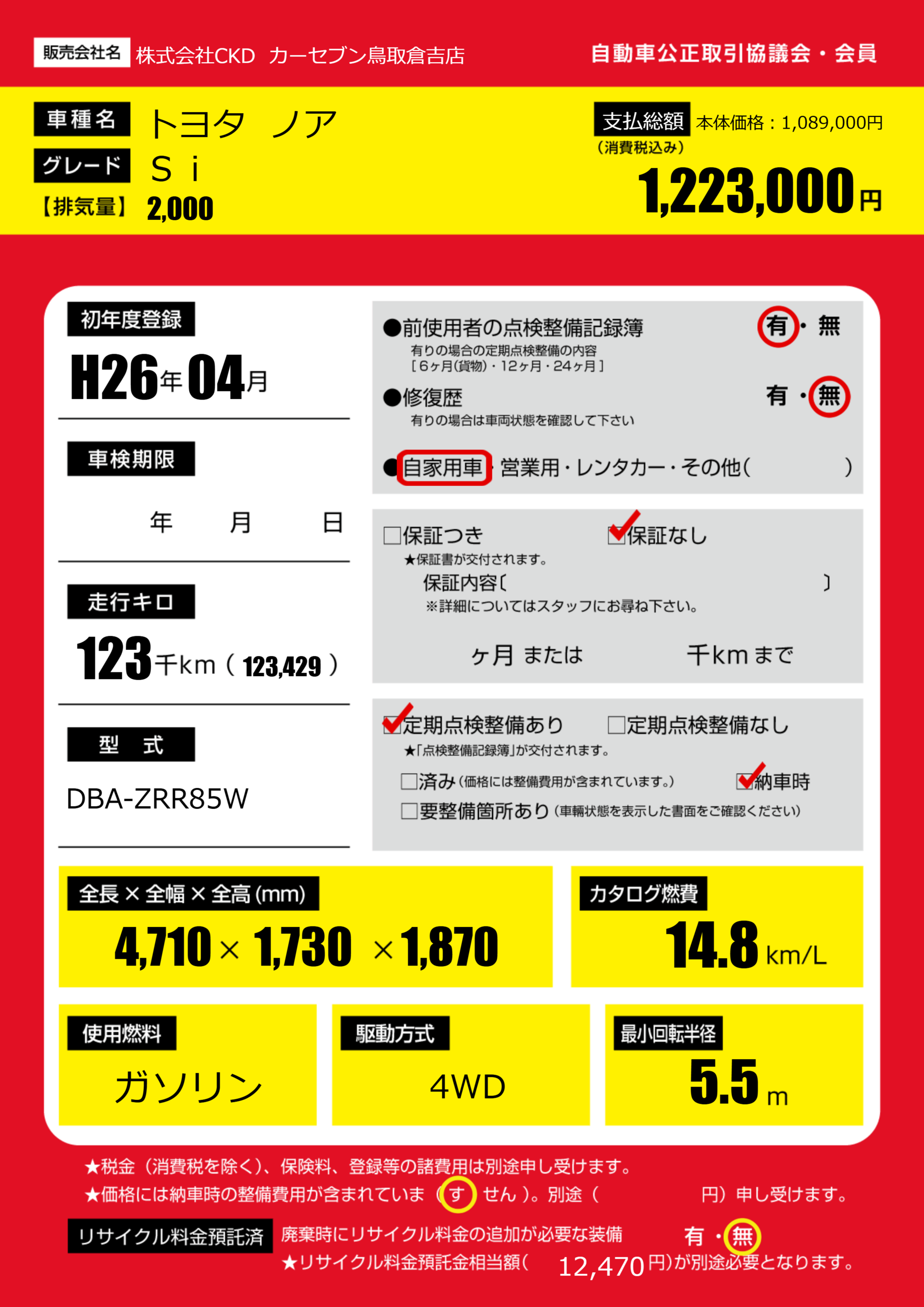 | 走行キロ | 12.3万km | 初年度登録 | H26年04月 |