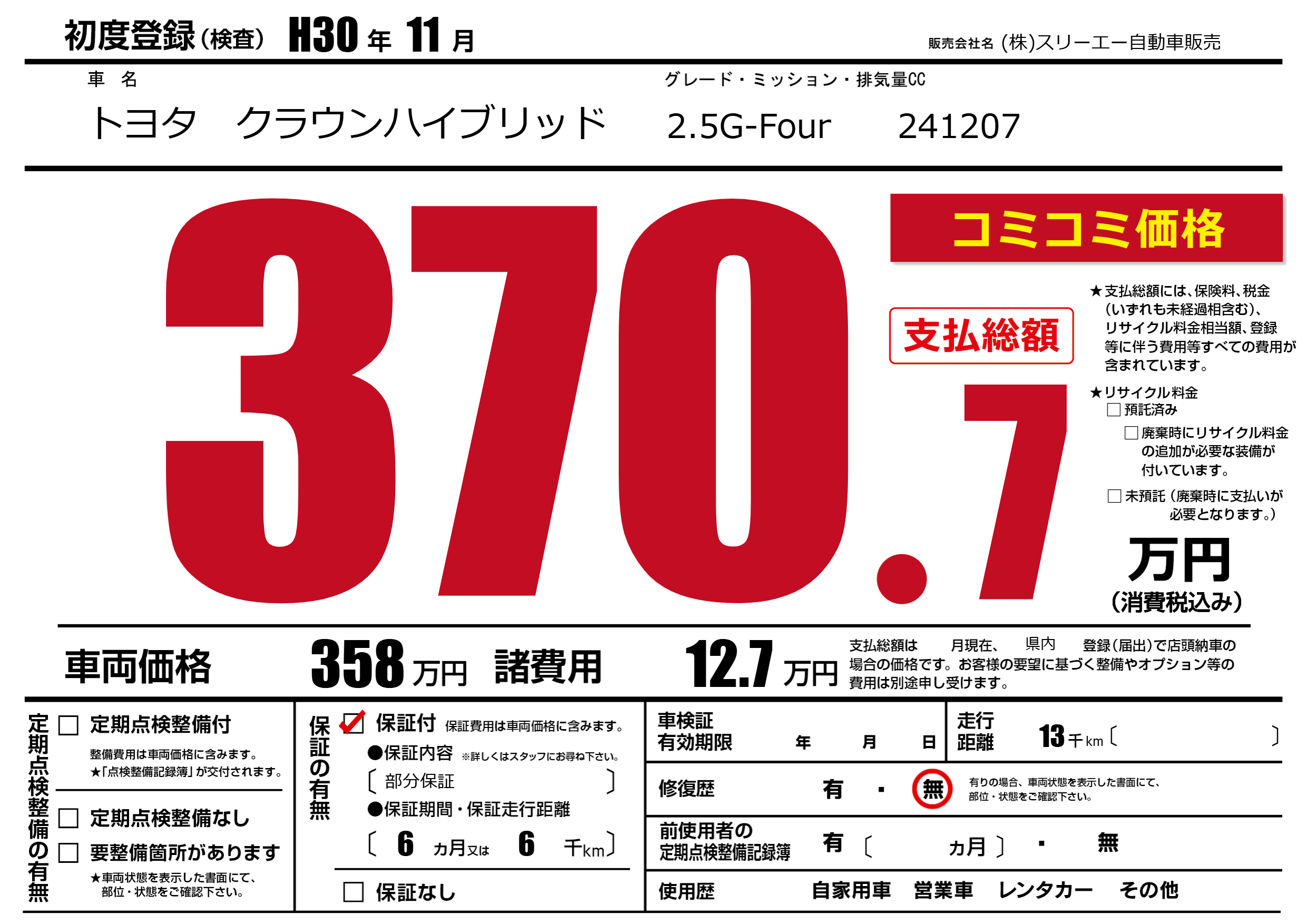 | 車名 | トヨタ クラウンハイブリッド | グレード ミッション 排気量 |