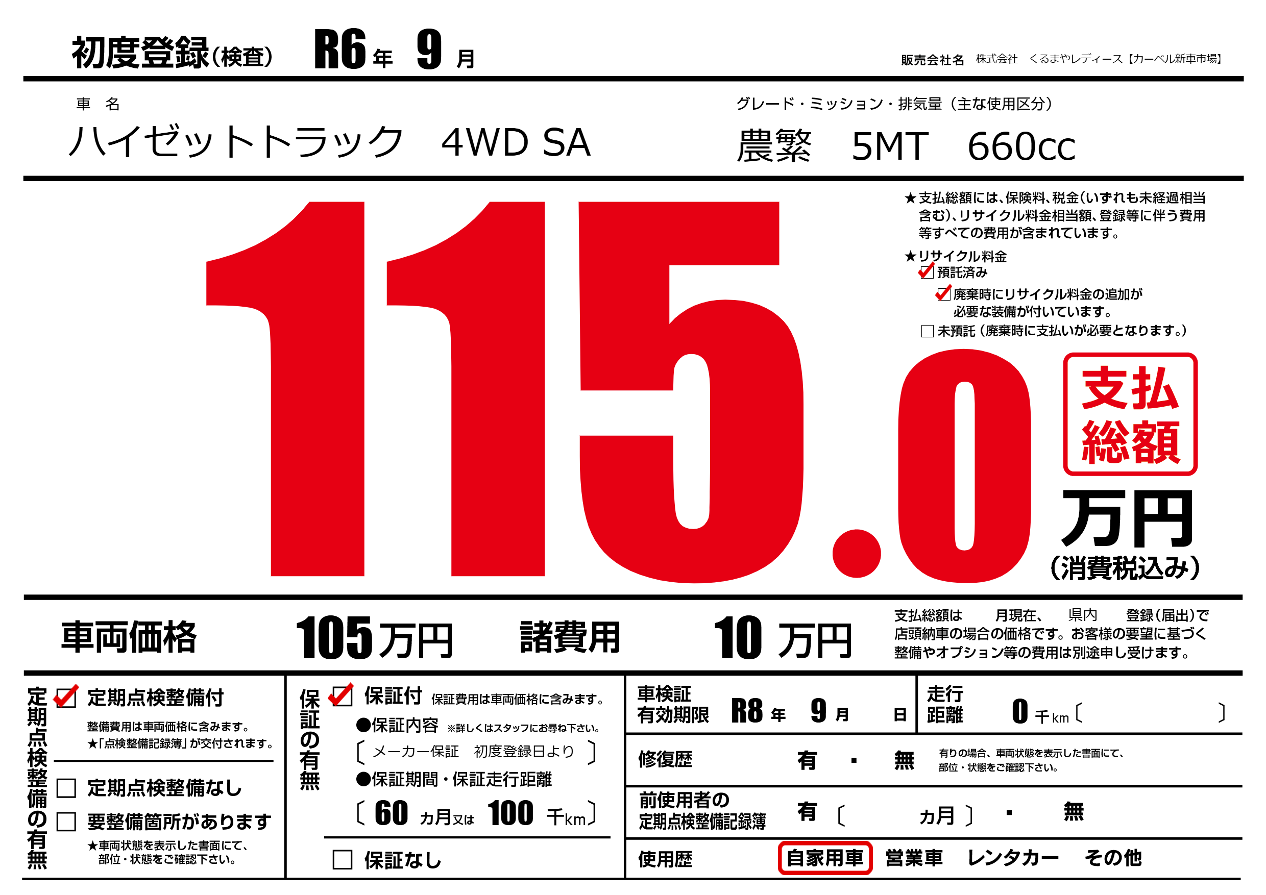 保証付き 保証内容(メーカー保証 初度登録日より) 60ヶ月または(100)千kmまで |