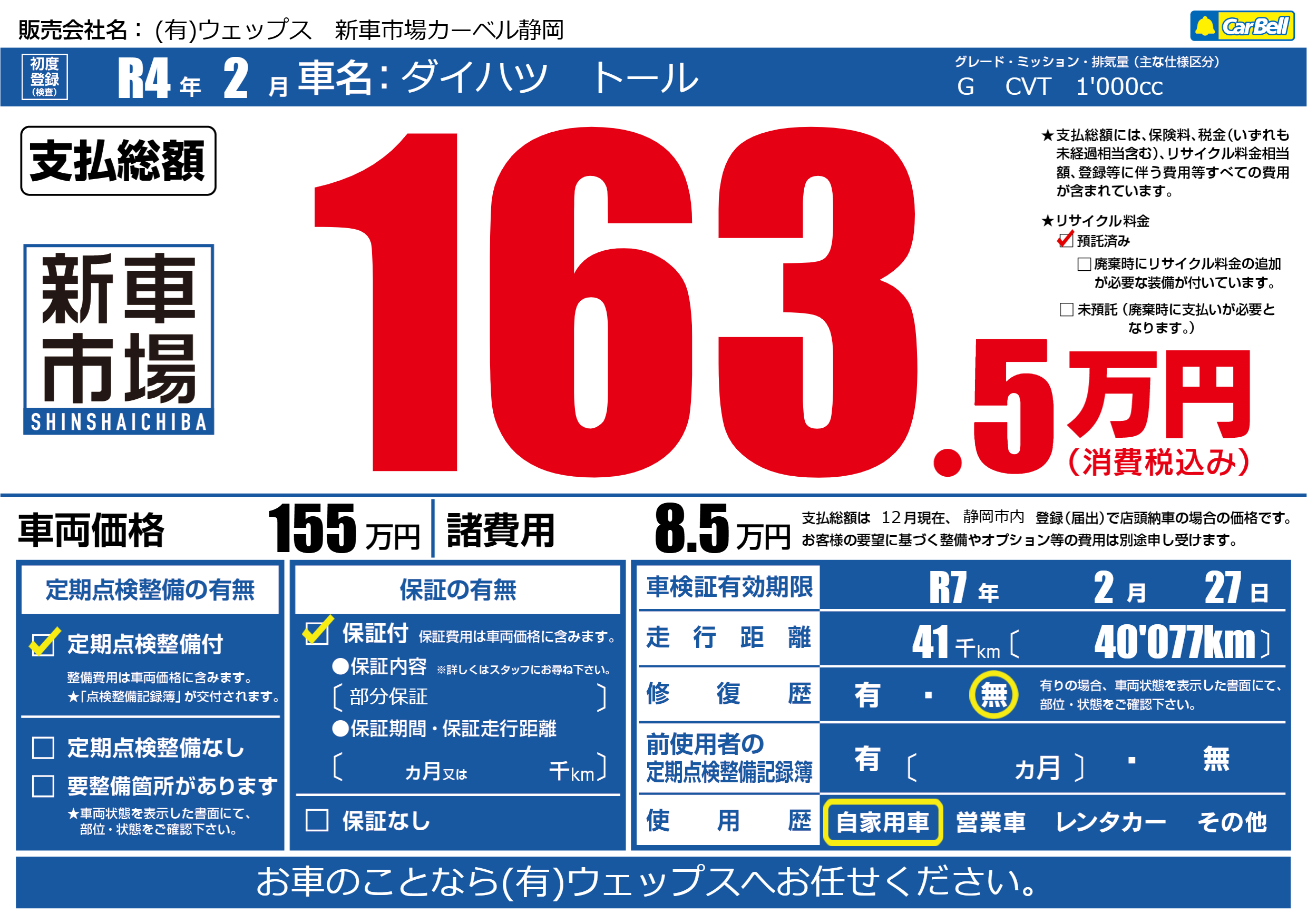 | 車検制限 | R7年 2月 27日 | ||