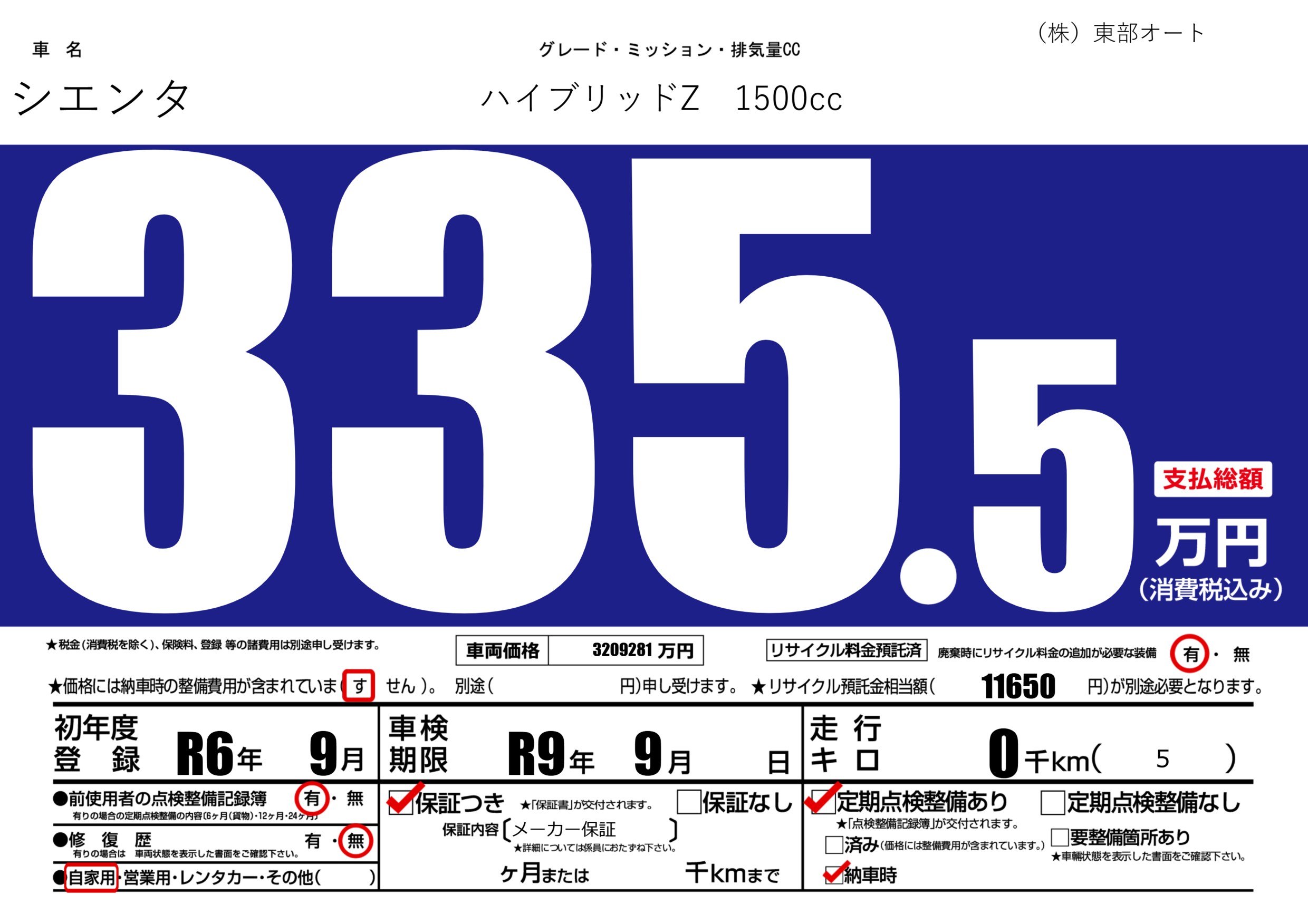 | 車名 | シエンタ | グレード ミッション 排気量 |