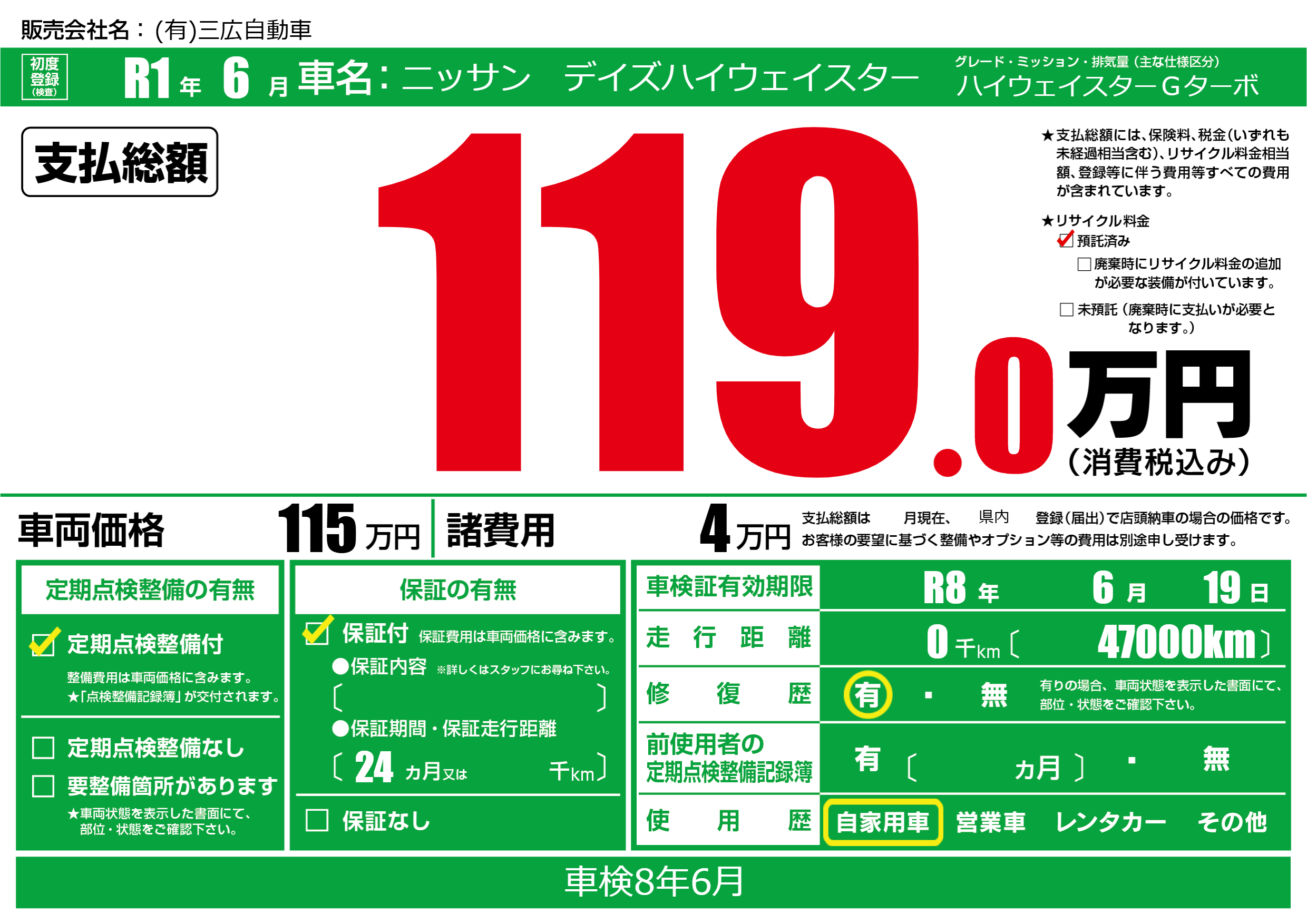 | 車名 | ニッサン デイズハイウェイスター | グレード ミッション 排気量 |