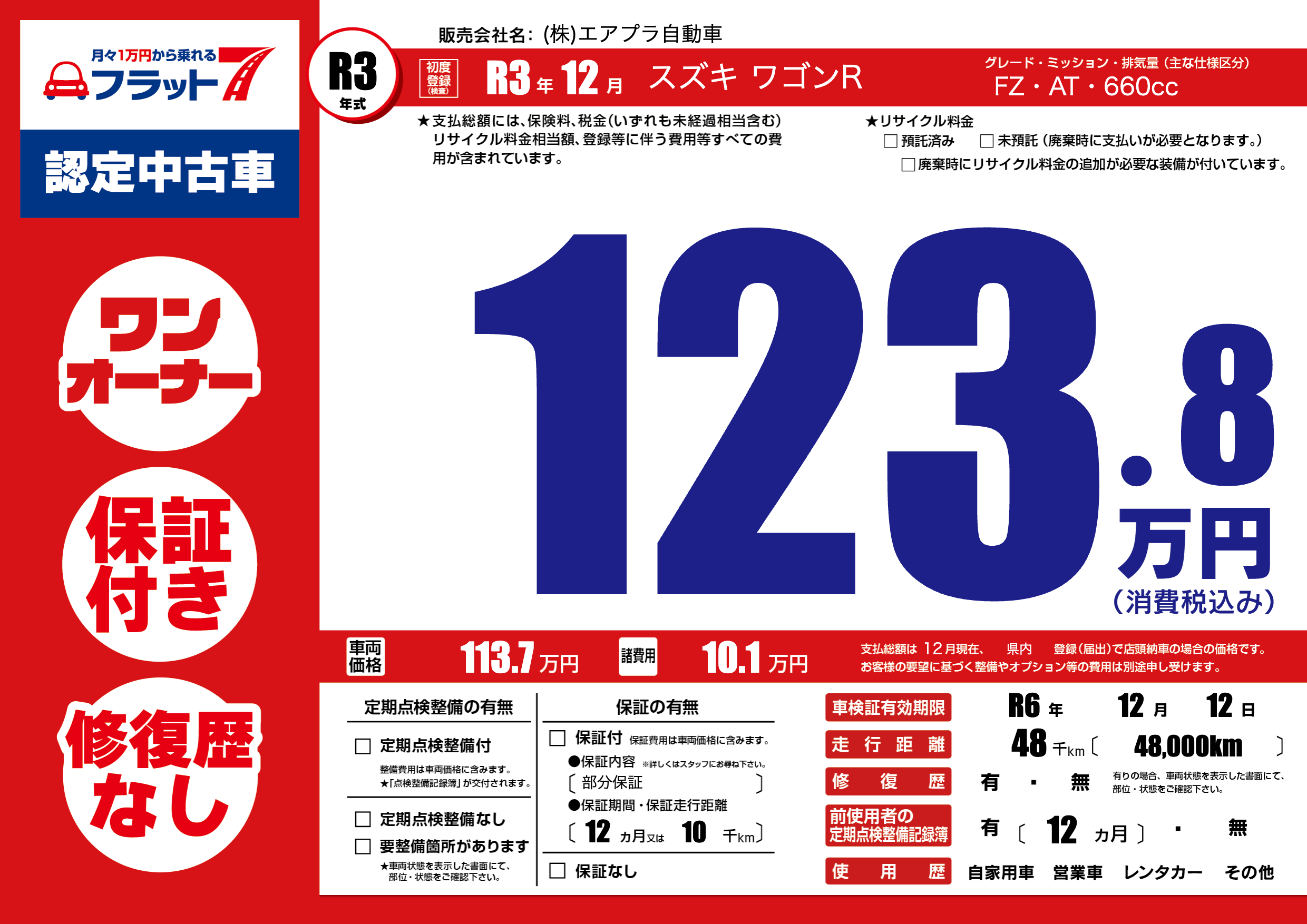 | 走行キロ | 4.8万km | 初年度登録 | R3年12月 |