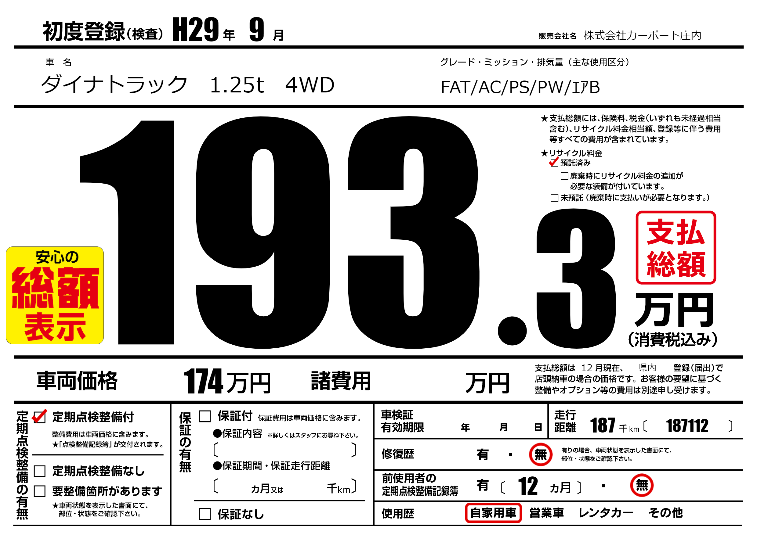 | 車名 | ダイナトラック 1.25t 4WD | グレード ミッション 排気量 |