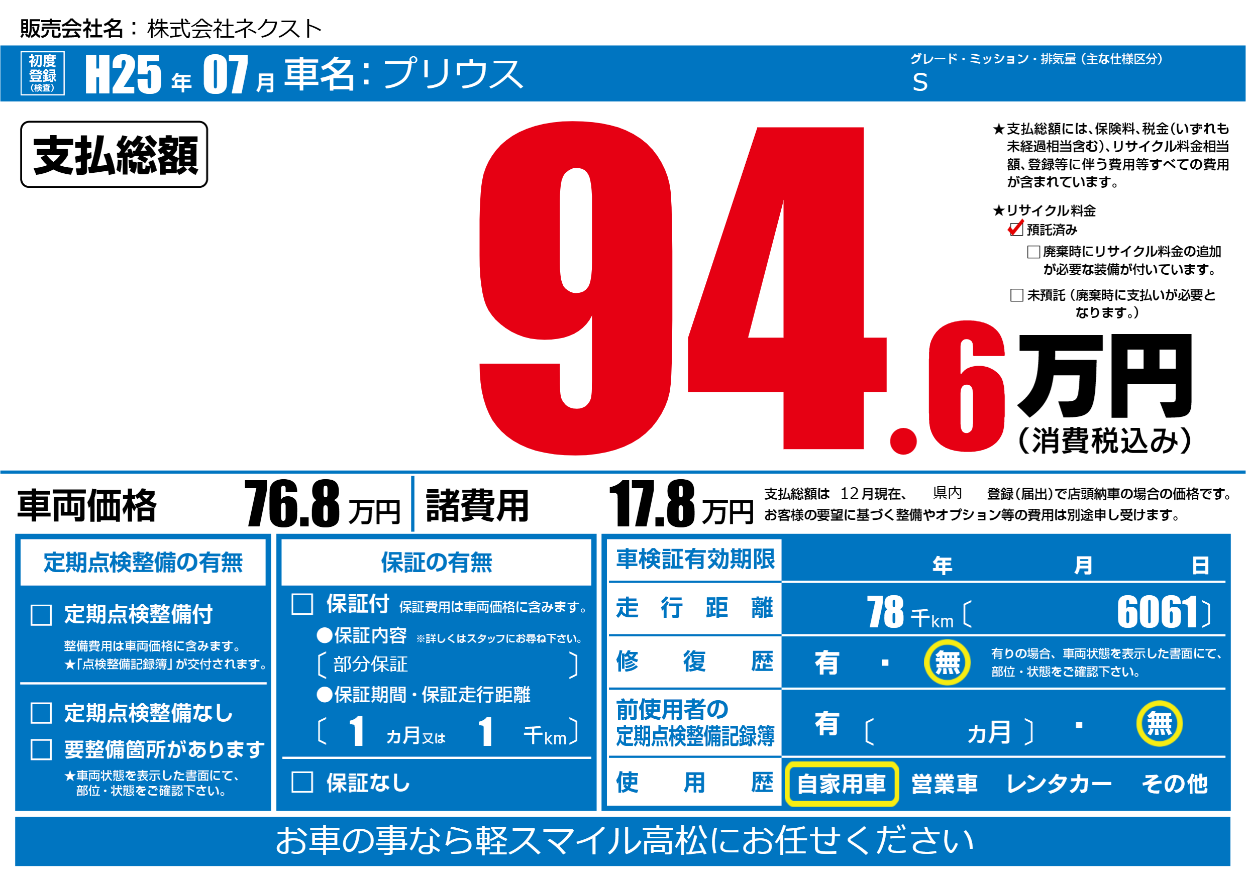 | 走行キロ | 7.8万km | 初年度登録 | H25年07月 |