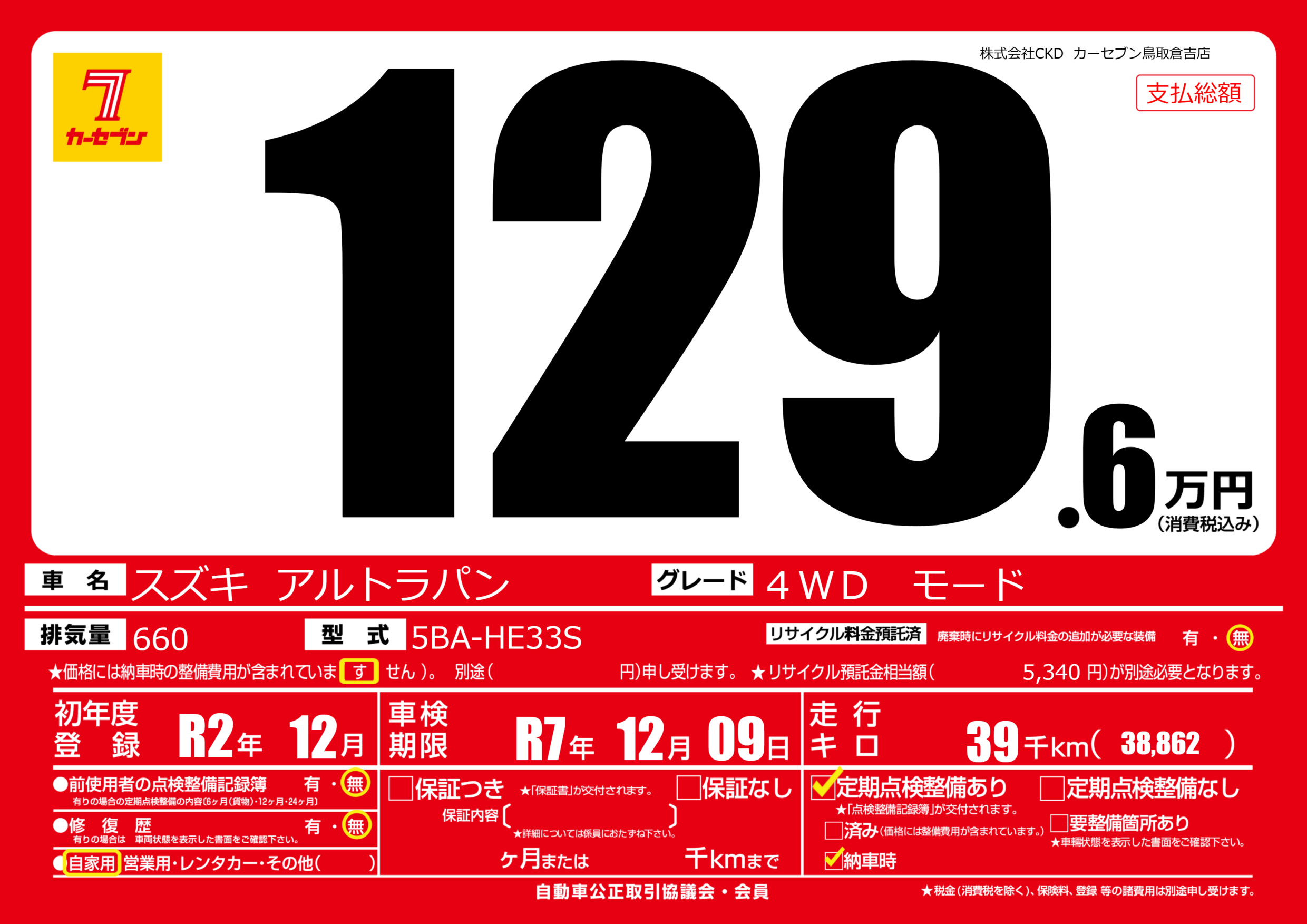 | 走行キロ | 3.9万km | 初年度登録 | R2年12月 |