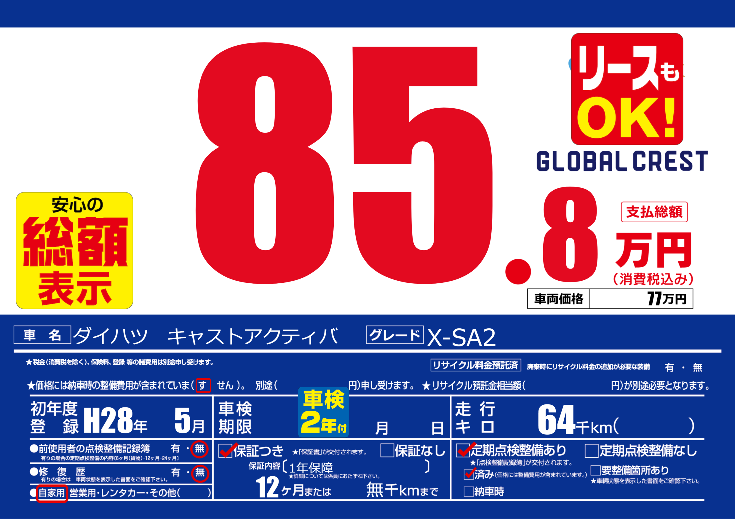 | 定期点検整備 | 定期点検整備あり 定期点検整備済み | ||