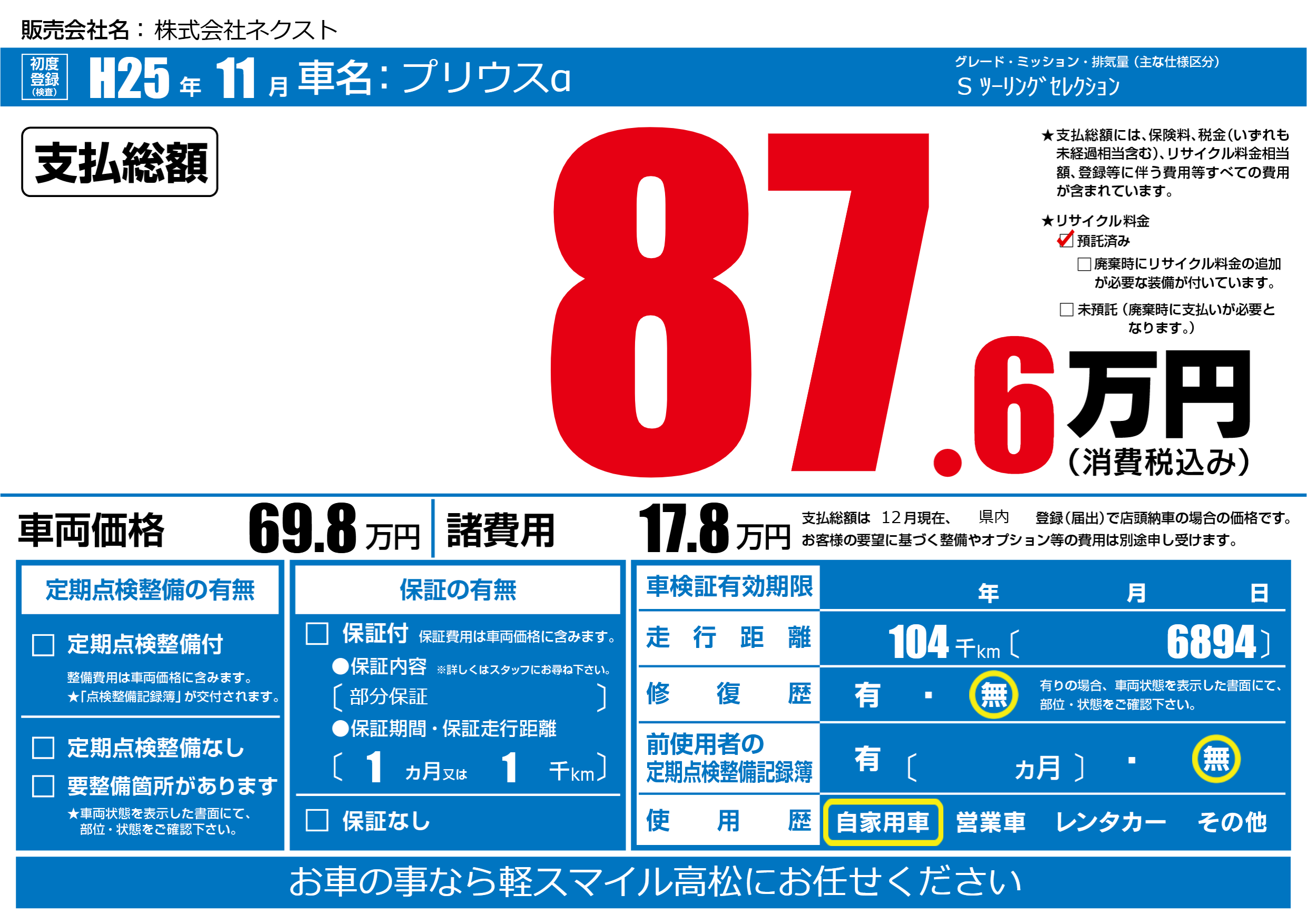 | 車名 | プリウスα | グレード ミッション 排気量 |